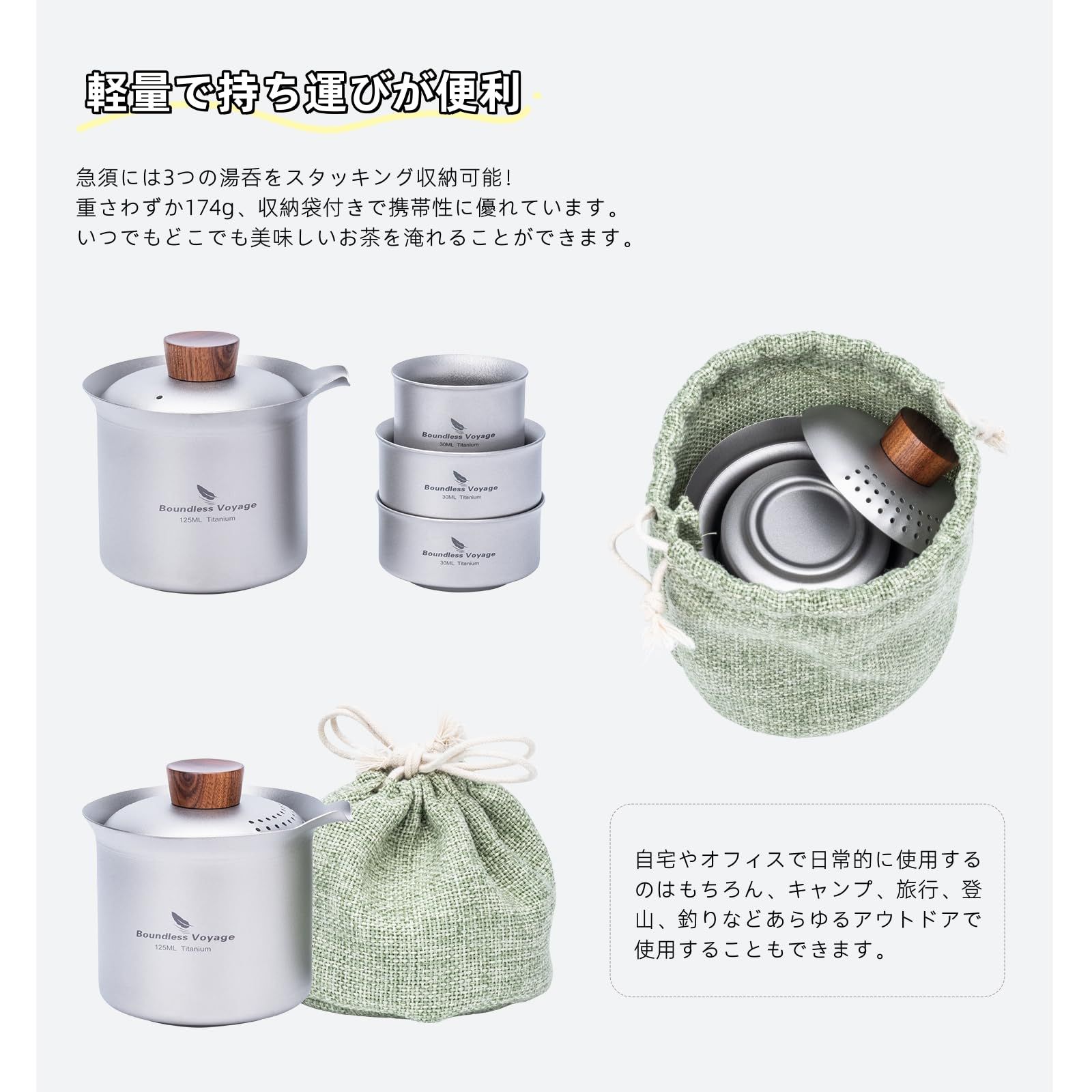 【軽量で持ち運びが便利】急須には3つの湯呑をスタッキング収納可能!重さわずか174g、収納袋付きで携帯性に優れています。自宅やオフィスで日常的に使用するのはもちろん、キャンプ、旅行、登山、釣りなどあらゆるアウトドアで使用することもできます。いつでもどこでも美味しいお茶を淹れることができます。