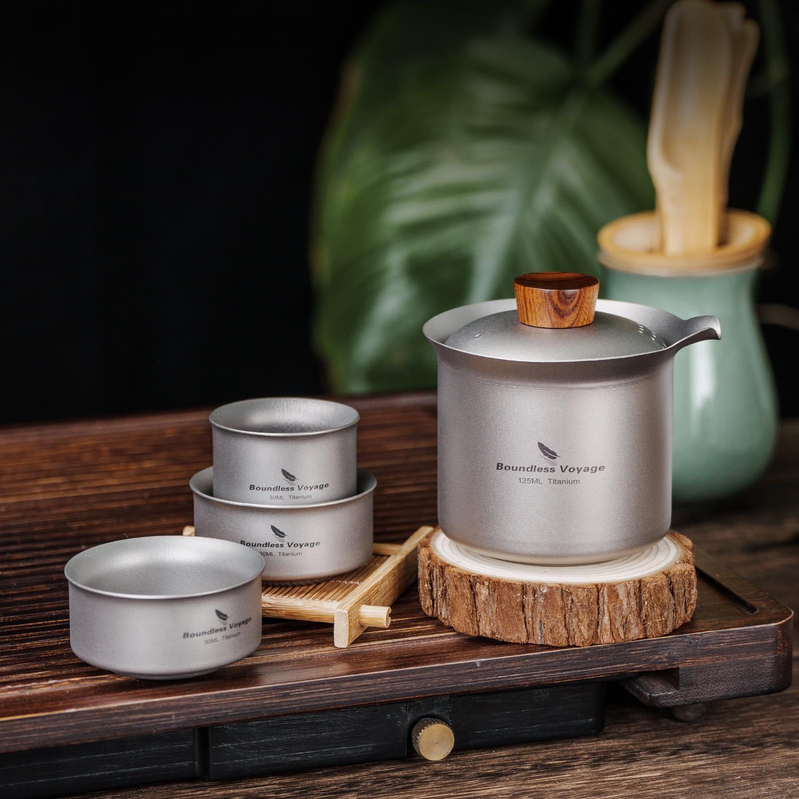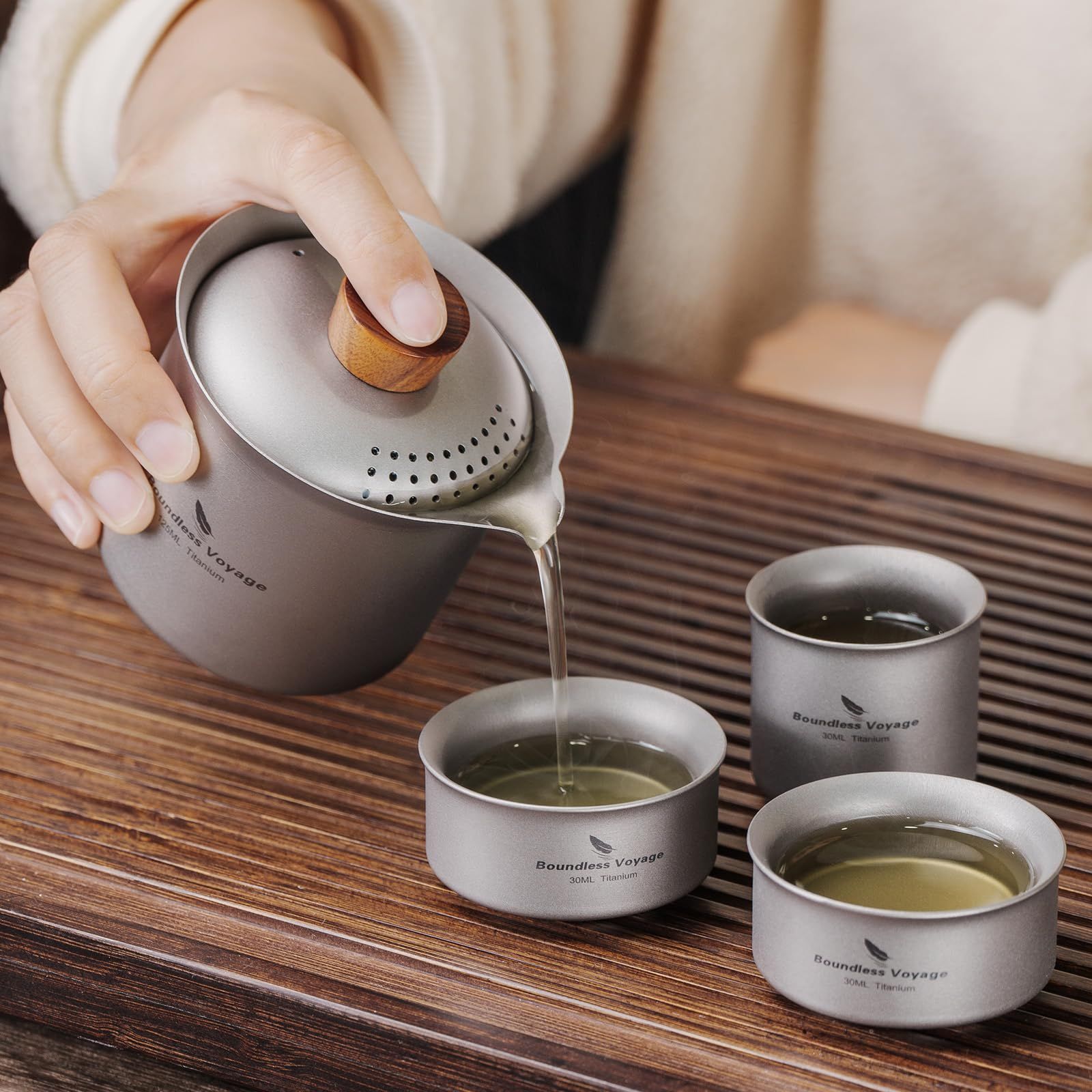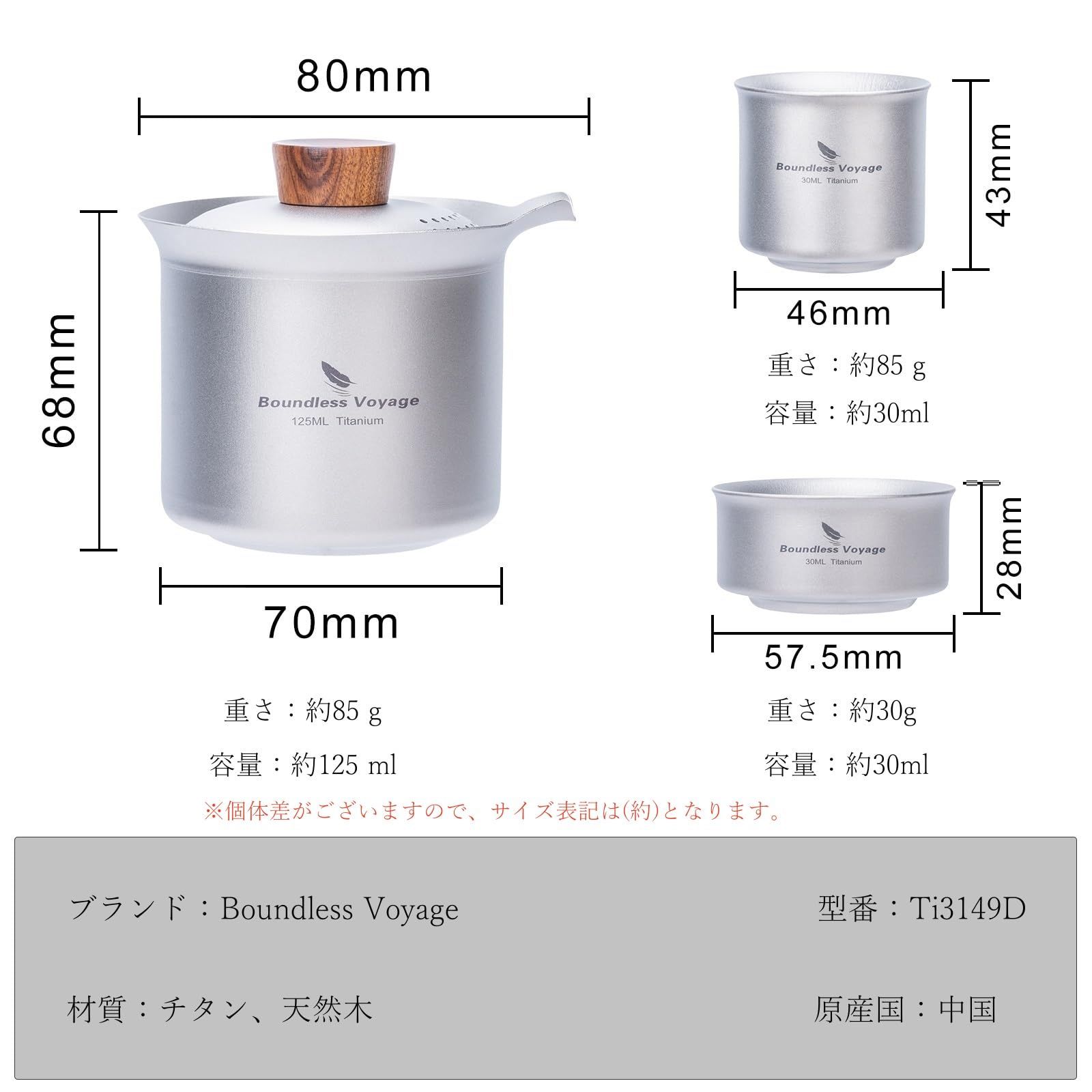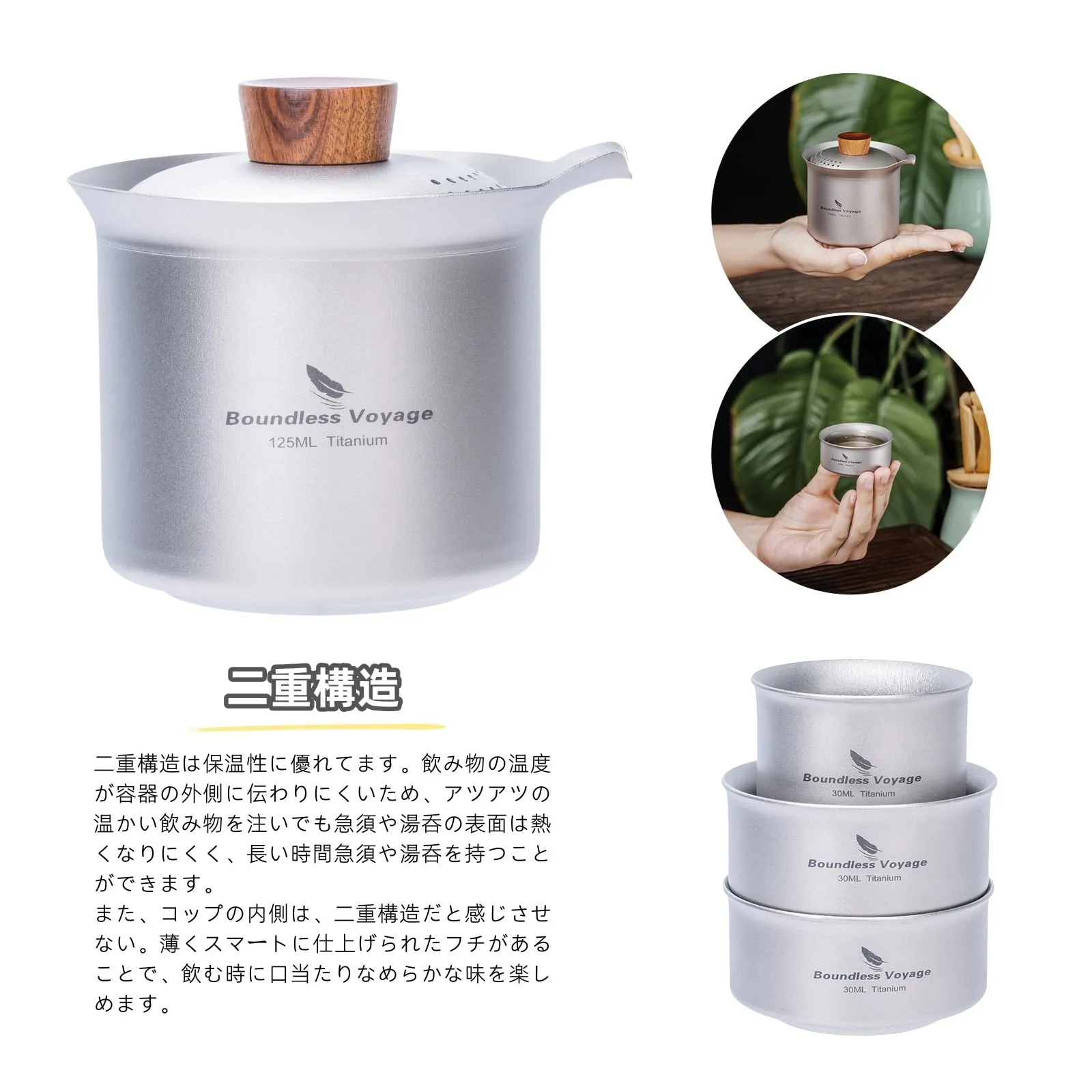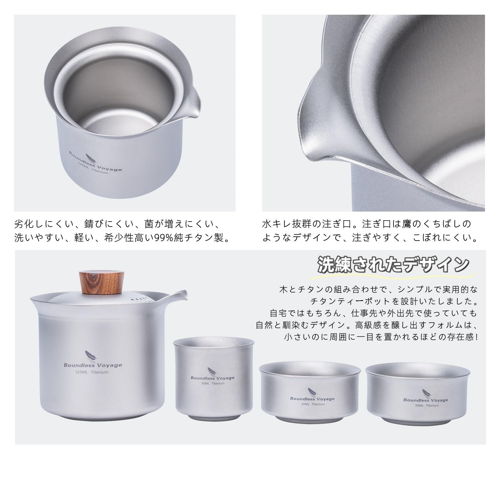 【商品詳細】材質:チタン・容量(約):急須125ml・湯呑み30ml・総重量(約):174g・収納サイズ(約):70×68mm・セット内容:急須×1、湯呑×3、収納袋×1