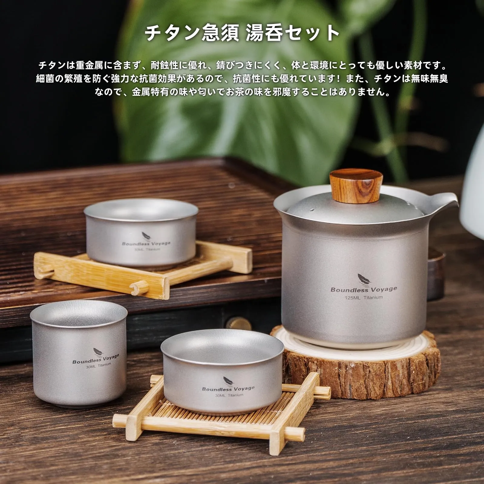 【チタン製の急須湯呑みセット】チタンは重金属に含まず、耐蝕性に優れ、錆びつきにくく、体と環境にとっても優しい素材です。細菌の繁殖を防ぐ強力な抗菌効果があるので、抗菌性にも優れています!また、チタンは無味無臭なので、金属特有の味や匂いもないのでお茶の味を邪魔することはありません。