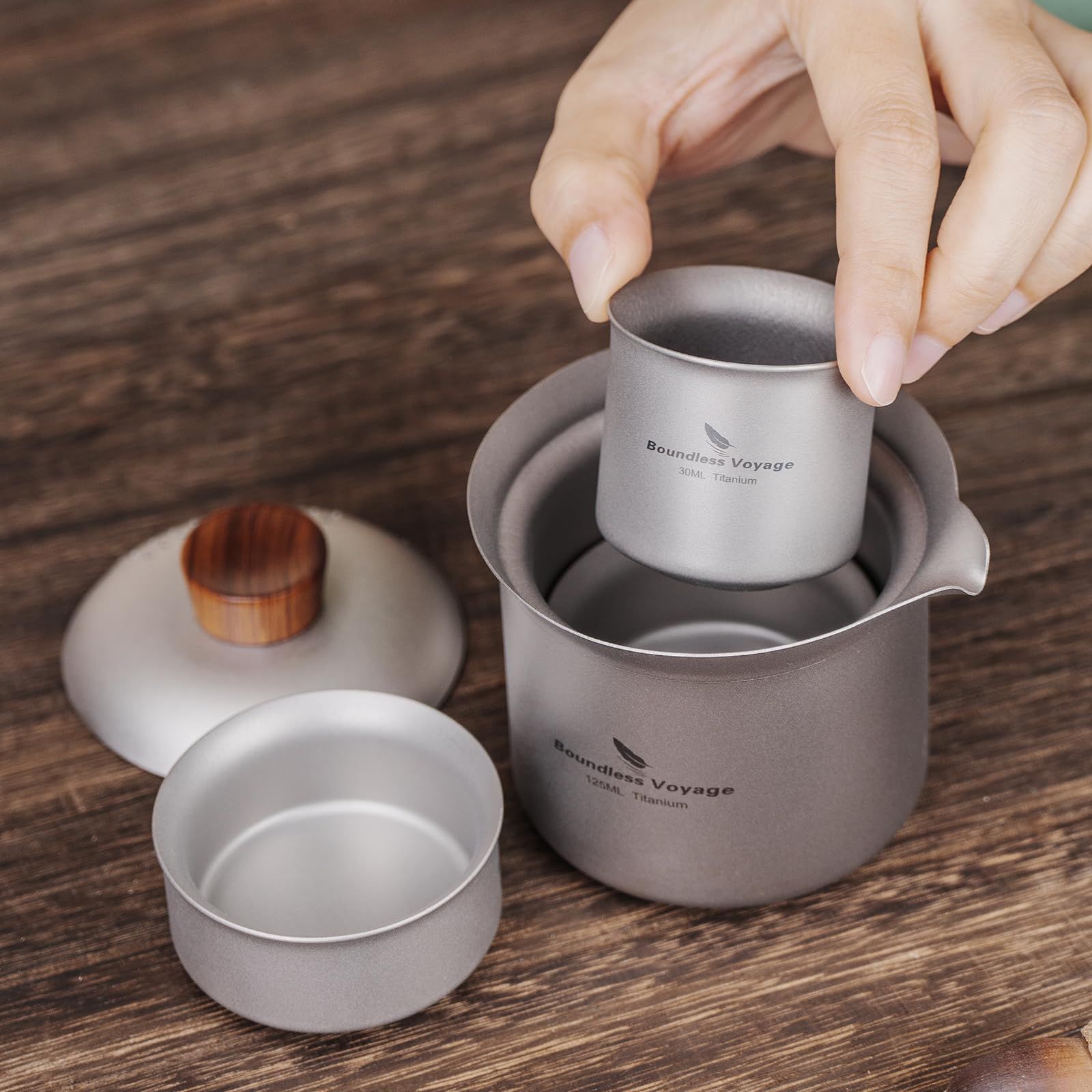 【洗練されたデザイン】木とチタンの組み合わせで、シンプルで実用的なチタンティーポットを設計いたしました。自宅ではもちろん、仕事先や外出先で使っていても自然と馴染むデザイン。高級感を醸し出すフォルムは、小さいのに周囲に一目を置かれるほどの存在感!