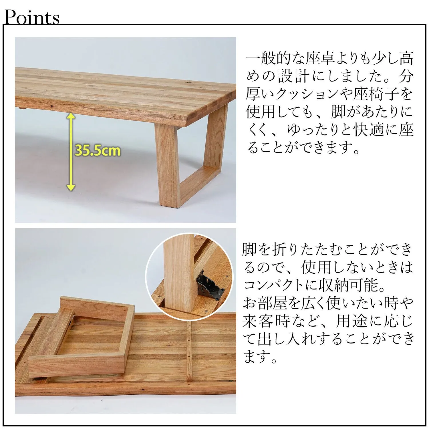 ・脚を折りたためるので、お部屋を広く使いたい時や急な来客時など、用途に応じて出し入れできます♪