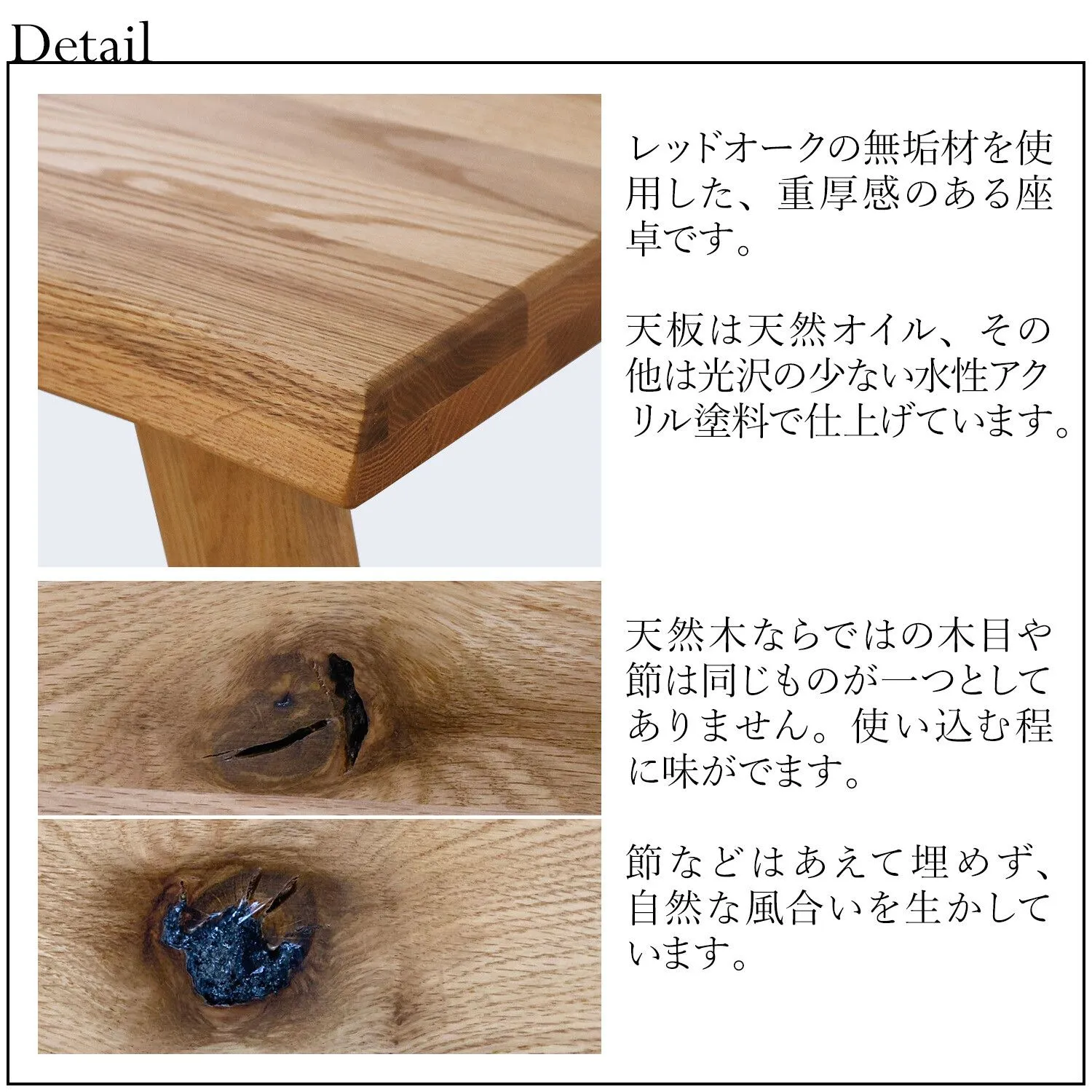 また、天然木の性質上、節や欠けた部分の埋め、継ぎ目に特有の個体差がございます。不良ではございませんので、