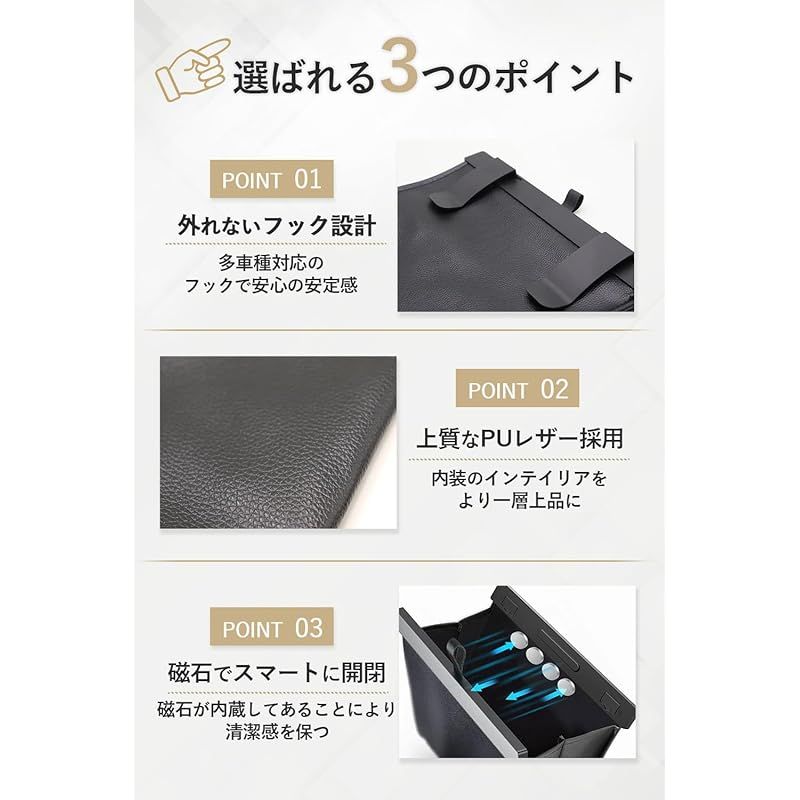 ?内装のインテリアに溶け込む上質なPUレザーを採用した車 ゴミ箱。高級感ある見た目でカー用品として映え、車 収納スペースをスタイリッシュに演出。カー用品 便利グッズ 車内としても最適で、ゴミ箱 車の違和感を抑えます。