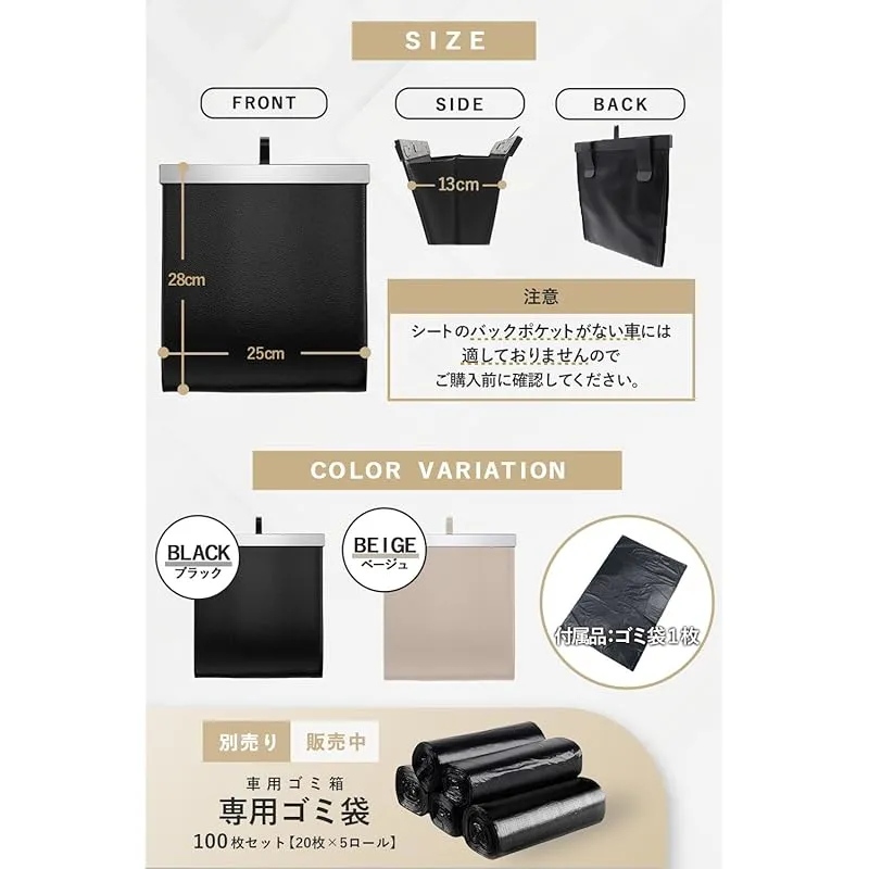 【多車種対応フック】 車用ゴミ箱 スリム 収納 小物入れ 袋付き カー用品 便利グッズ (ブラック)