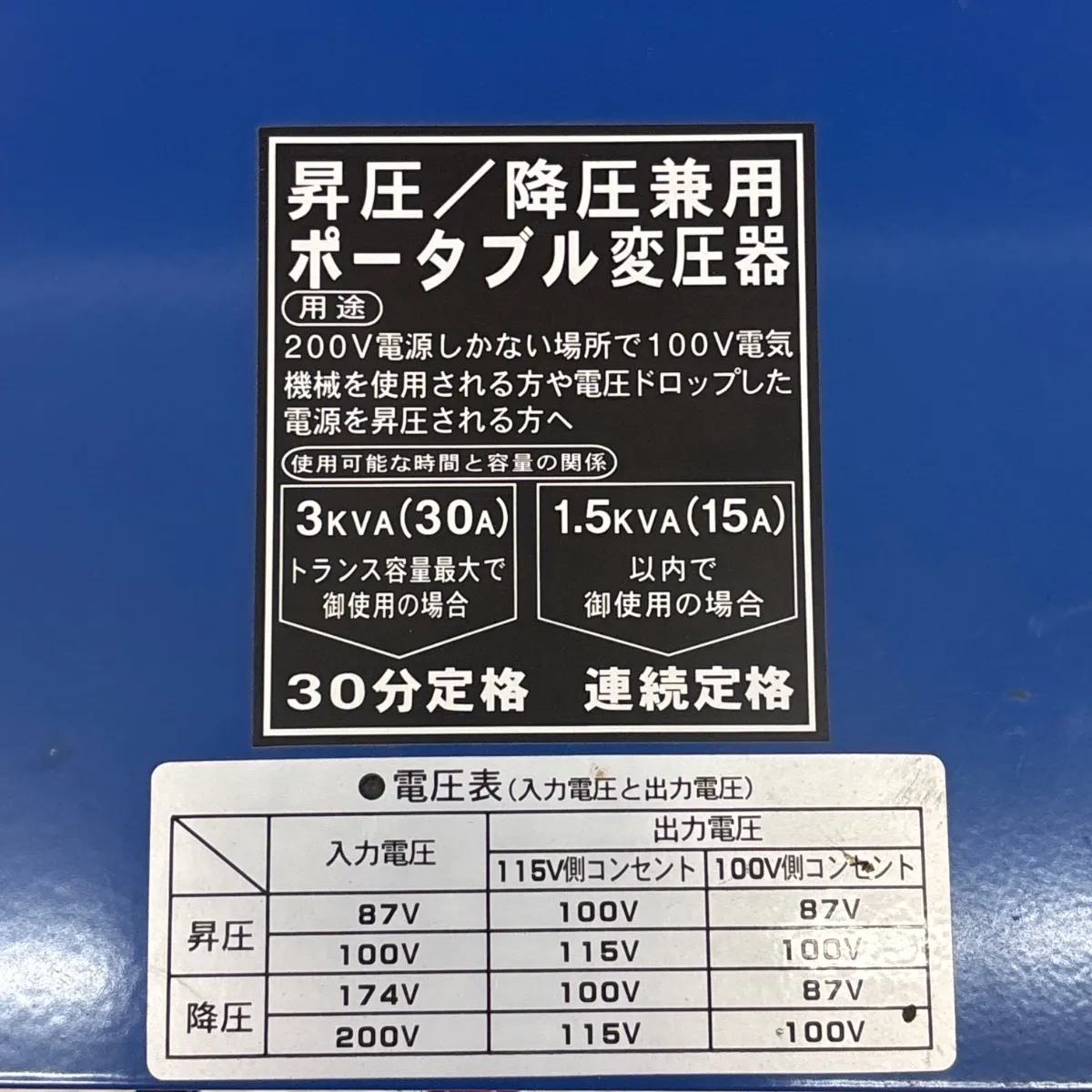 【新品・未使用品】 入力:100V/200V 出力:100V/115V 容量:3kVA(30分定格)/1.5kVA(連続定格) 50/60Hz対応 工事現場、溶接機、海外機器の電源変換に最適。 新品のため安心してご使用いただけます。