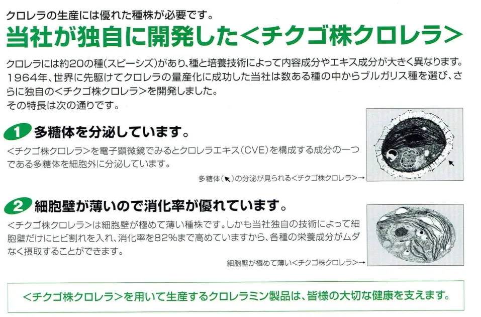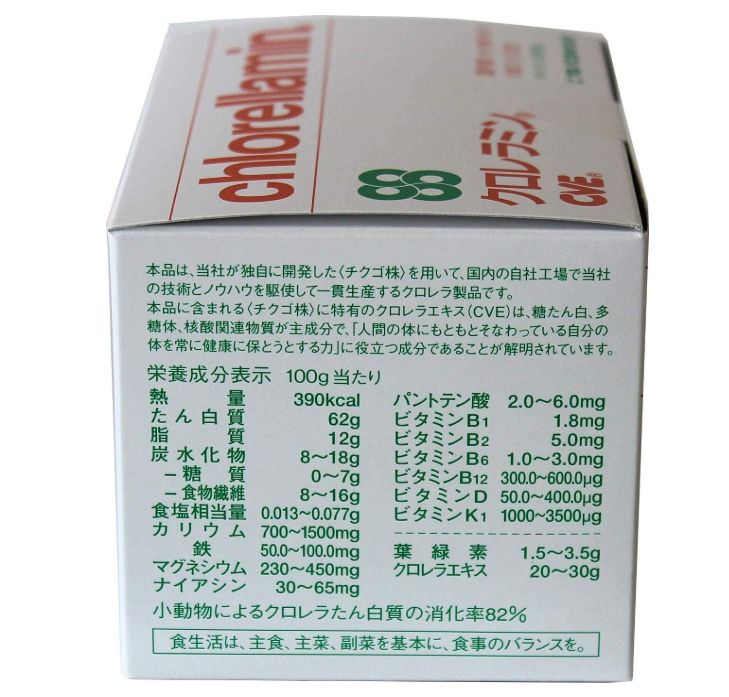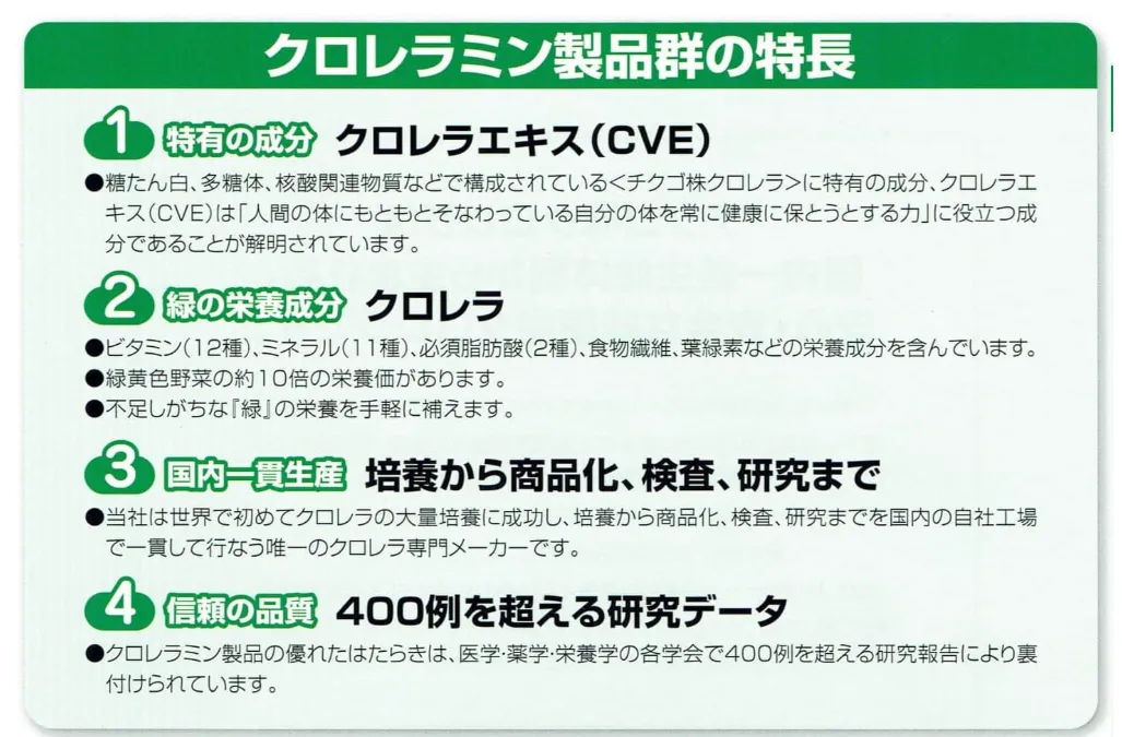 「クロレラミン CVE」は、国内で培養されたチクゴ株クロレラを使用した、クロレラ工業の人気商品です。