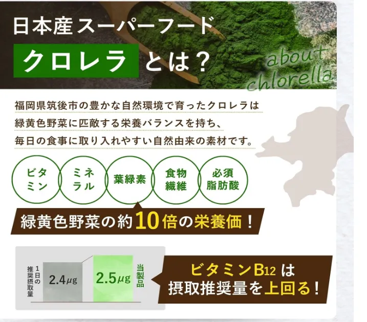 国内・筑後産クロレラを使用した、クロレラ工業のクロレラパウダーです。