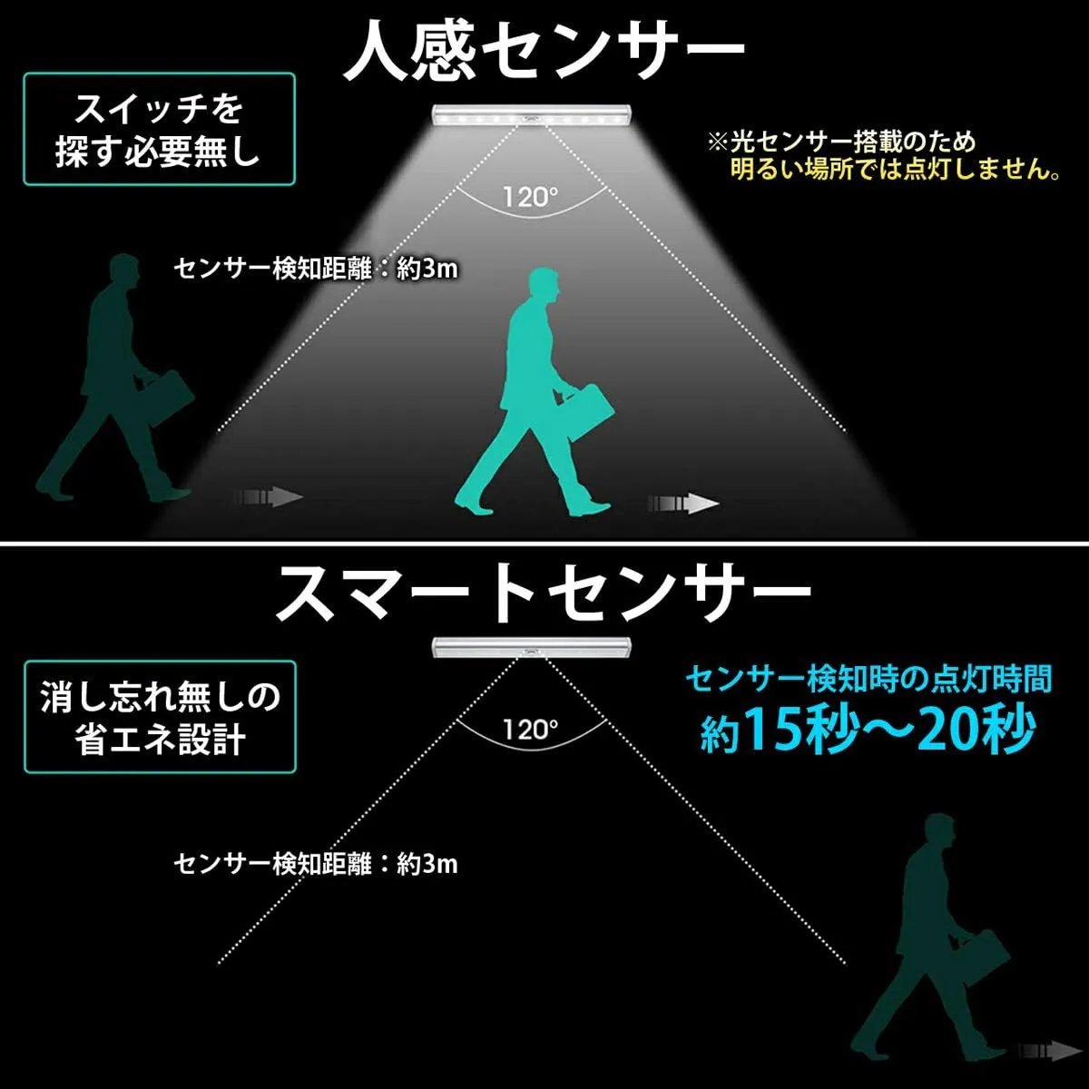 〖光・人感センサーを搭載〗:暗い場所だけで働く、人間が120度以内で最大3メートルの検出範囲内で夜間動作を検知するとすぐ点灯。感知範囲で離れなくて消灯しない。この範囲から離れて後15秒自動消灯。昼間或いは明るい場合に人体動きを感知しても点灯しない。