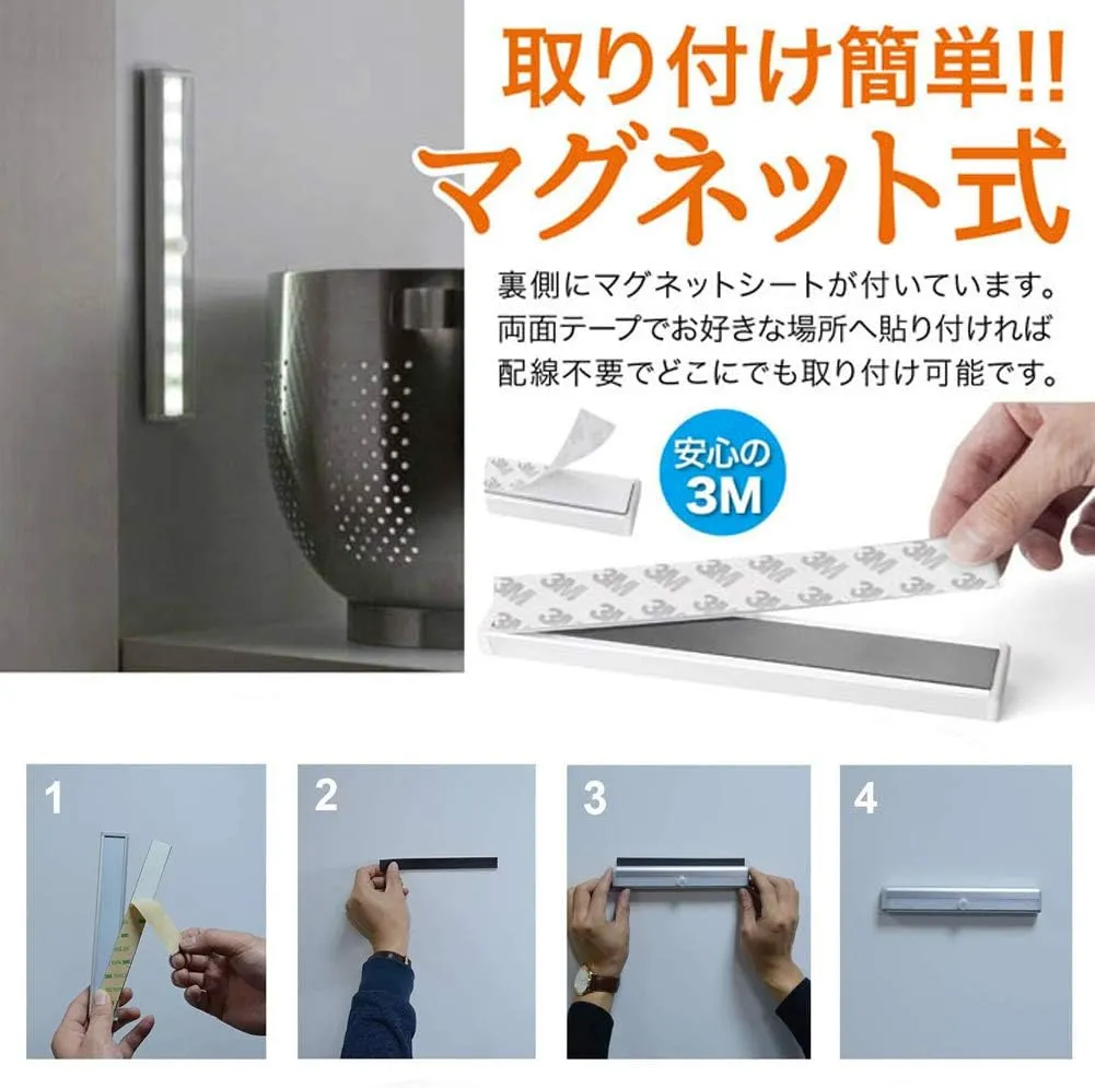 【工事不要で取り付け簡単】本体背面にマグネットと両面テープが装着されており、工具、ネジ、ナットは不要、壁に貼り付けるだけで簡単に設置が可能です。簡単に脱着ができるので、粘着テープを壁に取り付ければ、いつでも取り外して懐中電灯のように持って使うこともできます。