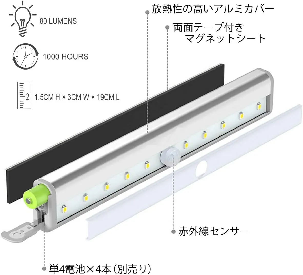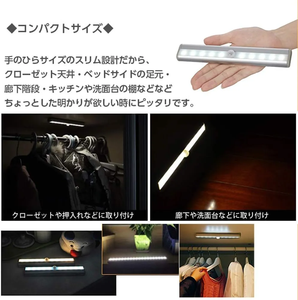 〖省エネ、経済的〗乾電池式の長寿命のLED電球を使用しており経済的です。タッチレスで自動で点灯及び消灯をするため、ご使用時以外に無駄な電気を使わない省エネ、節電可能なLEDライトバーです。また光センサーを内蔵しているので明るい場所ではライトは点灯せず電池を無駄に消耗しません。