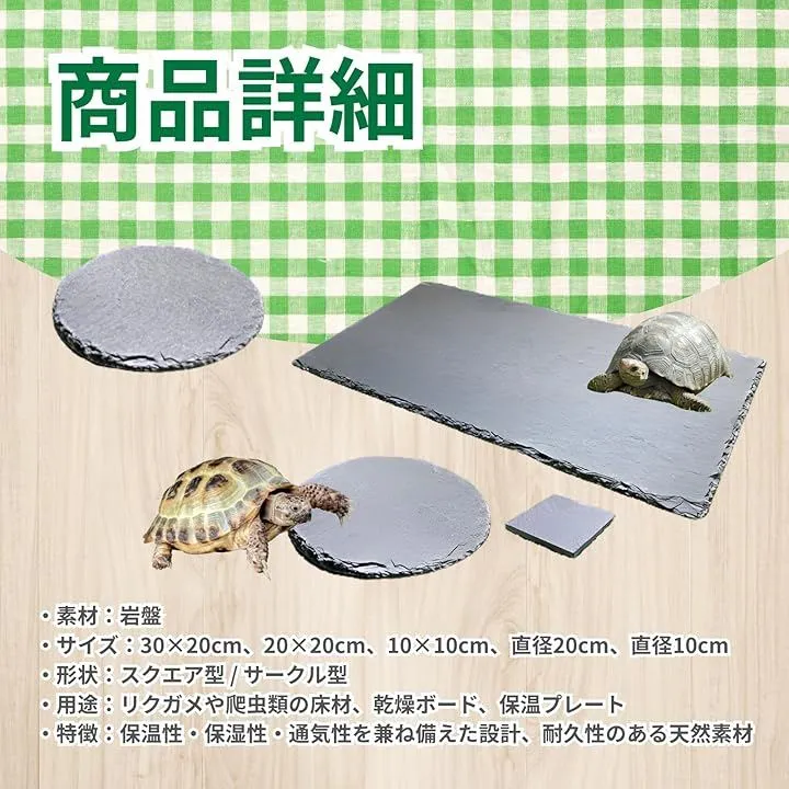 「商品詳細」 ・素材:岩盤 ・サイズ:画像参照 ・形状:スクエア型・ラウンド型 ・用途:リクガメや爬虫類の床材、乾燥ボード、保温プレート ・特徴:保温性・保湿性・通気性を兼ね備えた設計、耐久性のある天然素材