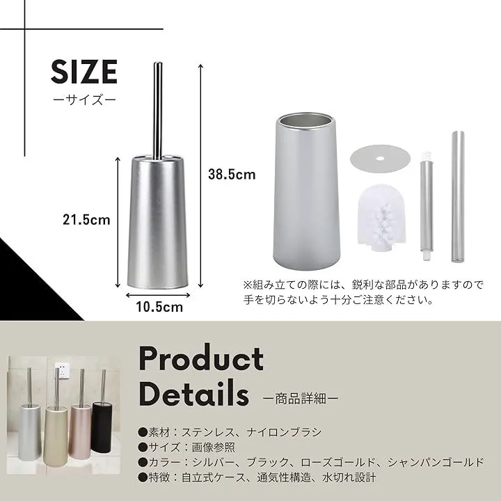 「商品詳細」 素材:ステンレス、ナイロンブラシ サイズ:画像参照 カラー:シルバー、ブラック、ローズゴールド、シャンパンゴールド 特徴:自立式ケース、通気性構造、水切れ設計、コンパクト収納、省スペース設置 *組み立ての際には、鋭利な部品がありますので手を切らないよう十分ご注意ください。