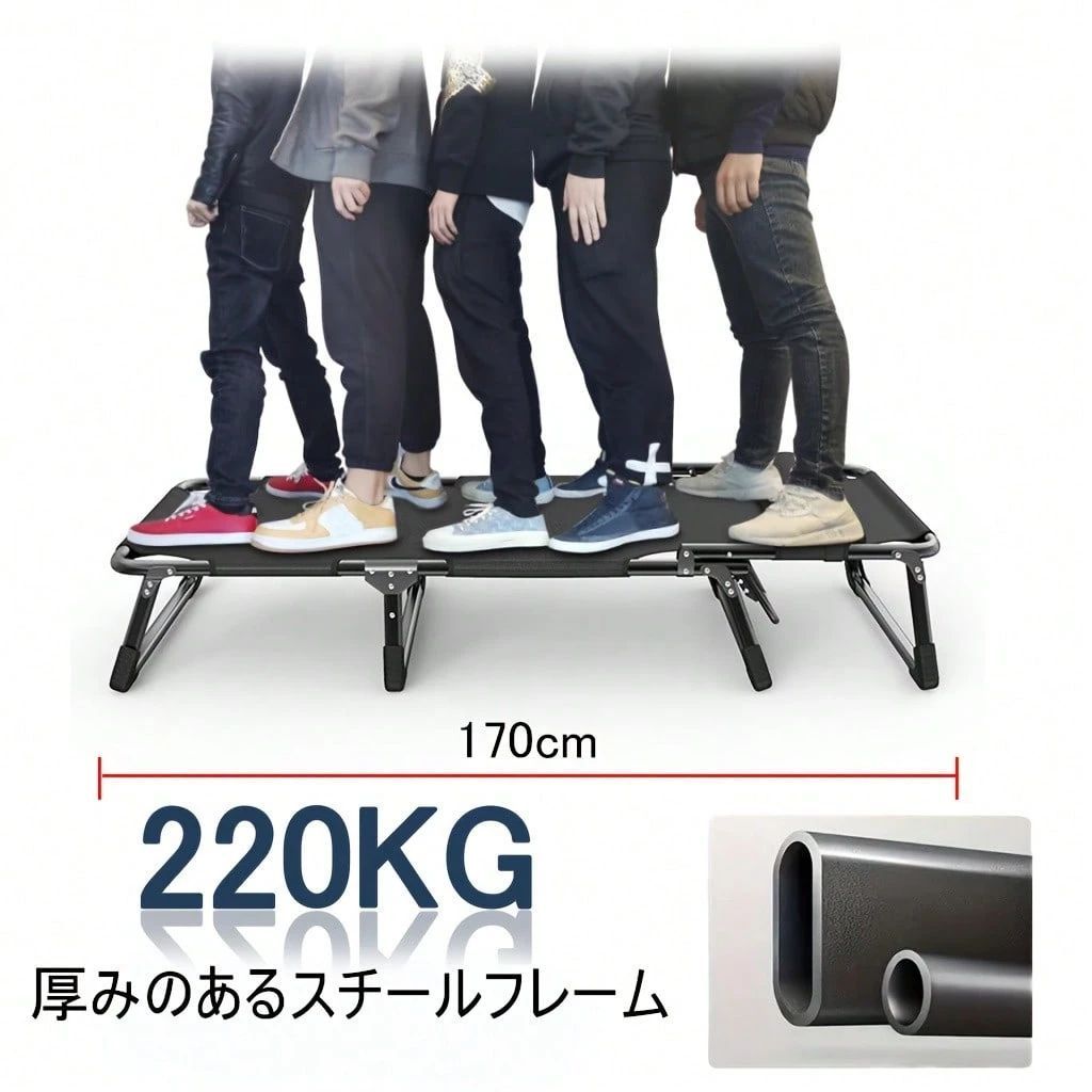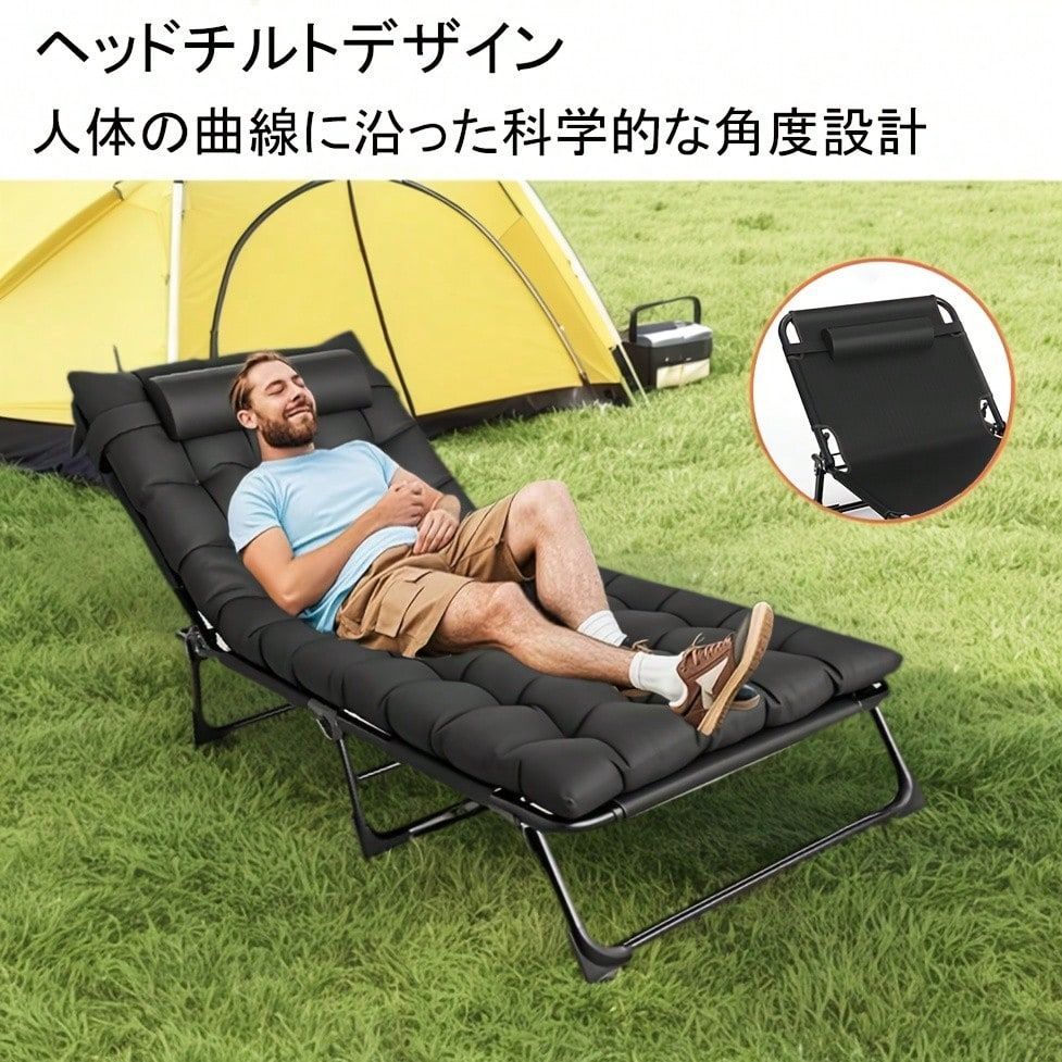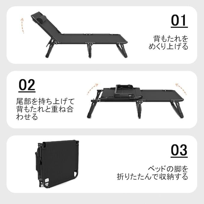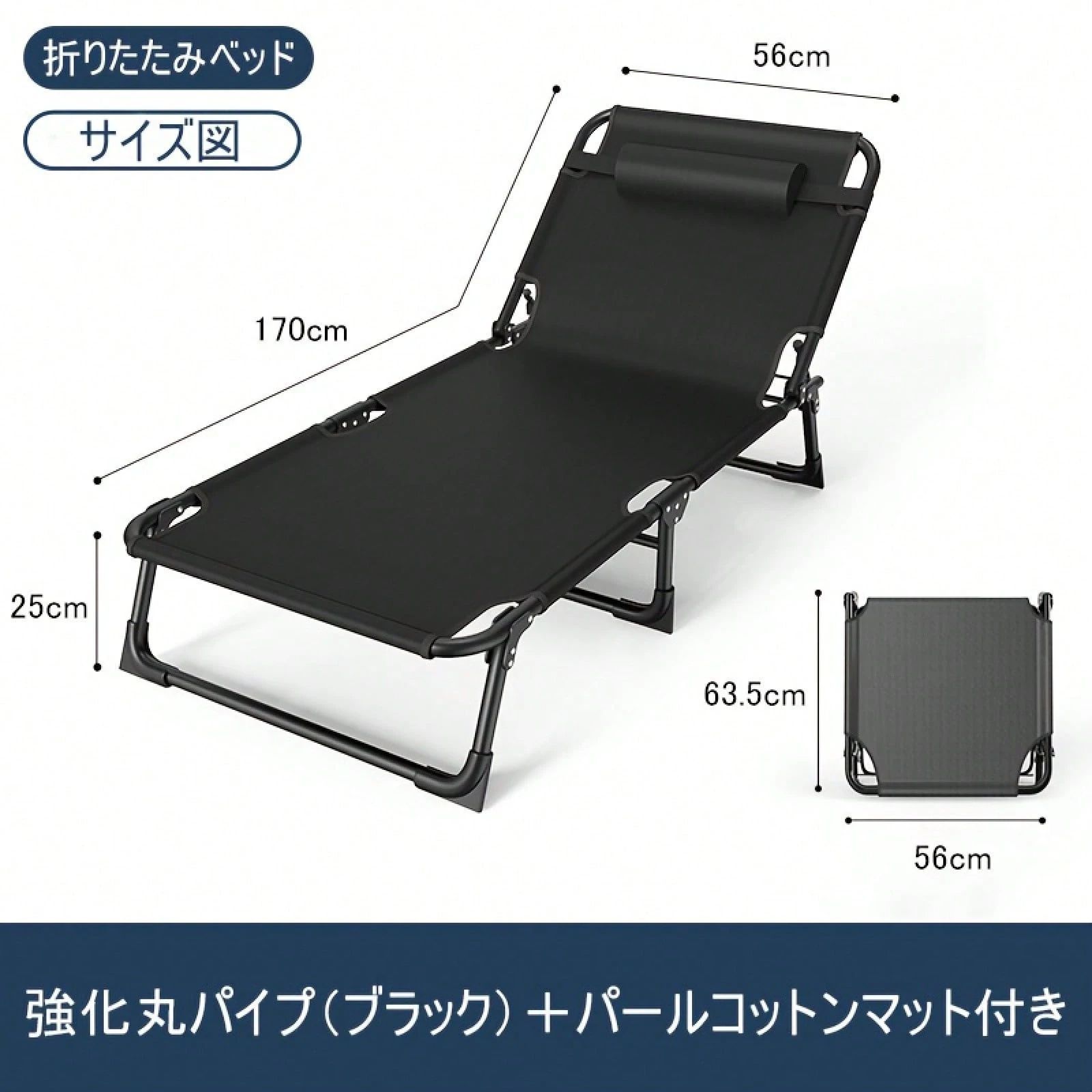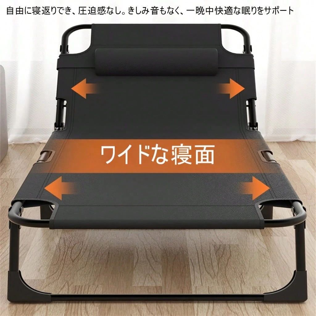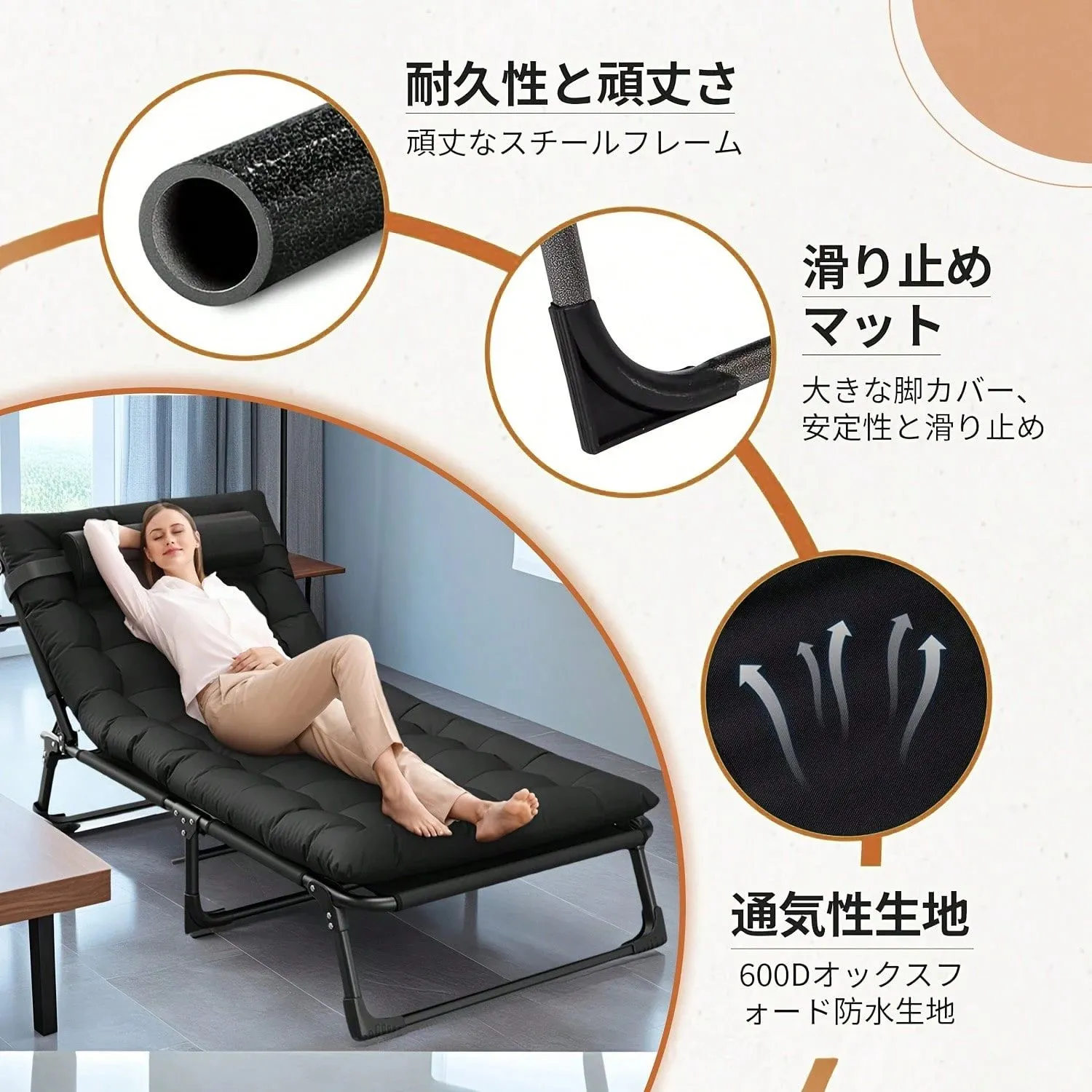 展開時は全長 170cm のシングルサイズでゆったりとした眠りを実現。簡単に折りたためるため、ドアの裏や机の下など狭いスペースにも収納可能。折りたたみ時の占有面積を最小限に抑え、寝室やオフィスでもスペースを有効活用できます。必要な時にすぐ展開でき、いつでも快適な休憩スペースを確保できます。ご注意:ヘッドレストの幅は画像参考となり、実物は若干小さくなります。 マットレスなしの本体重量は約 4kg です。