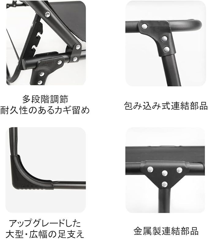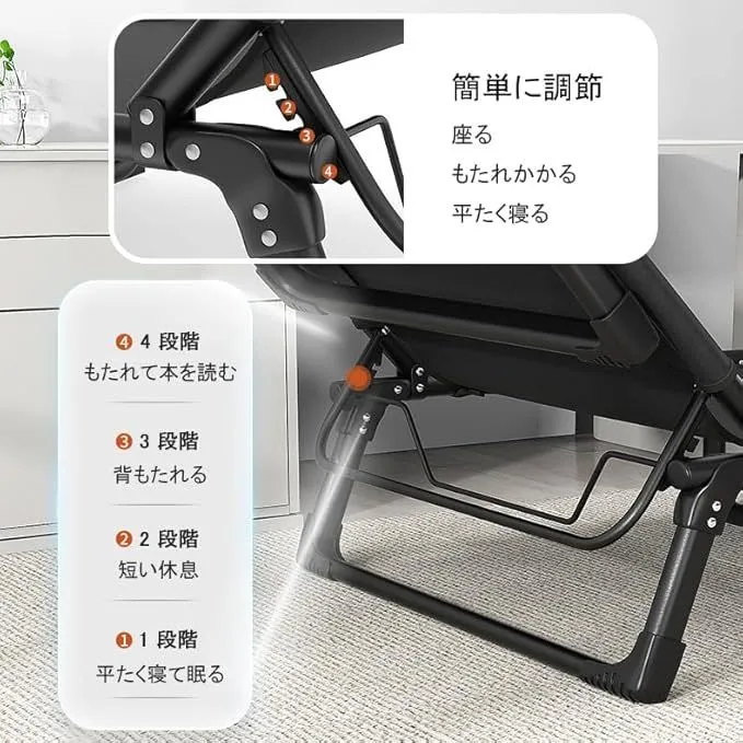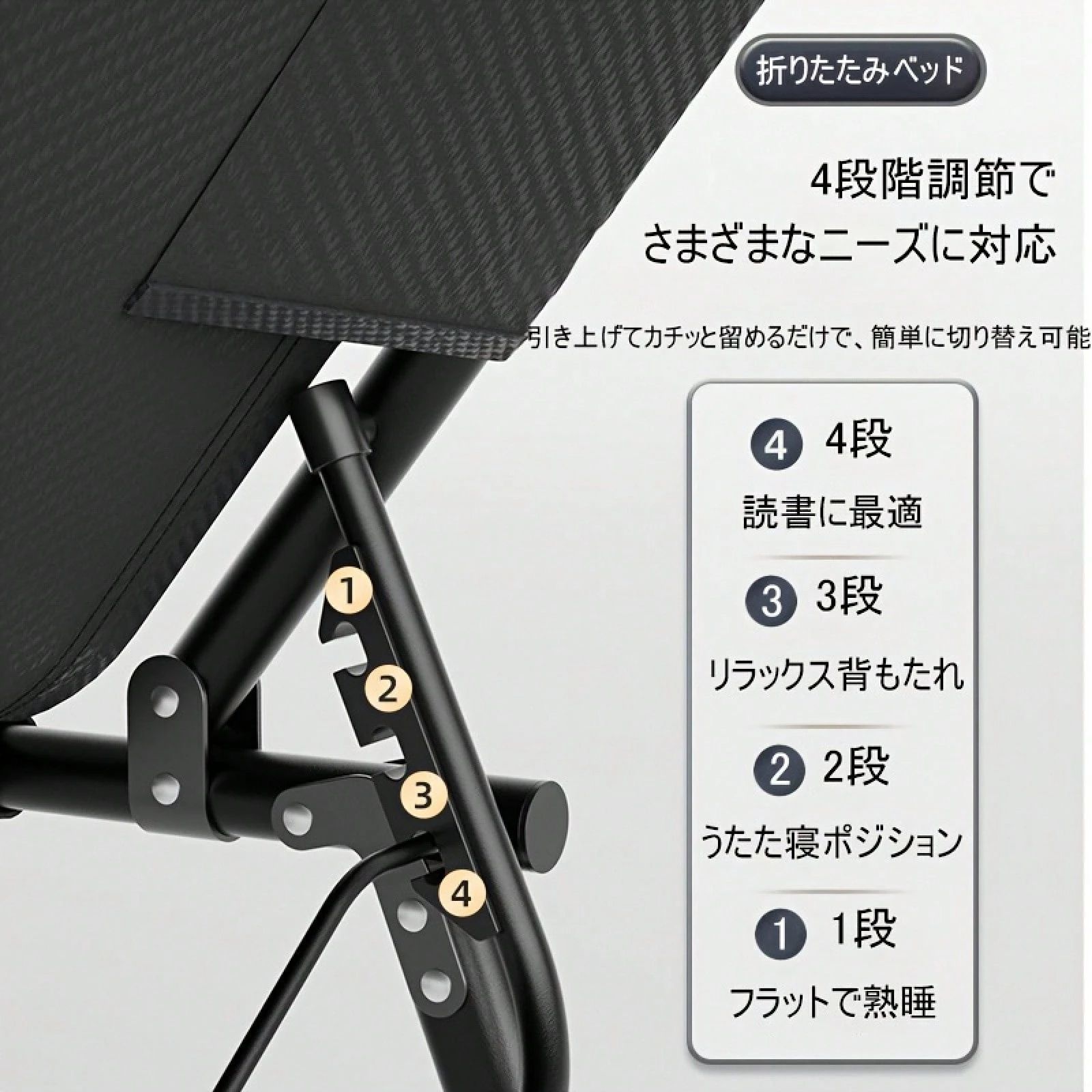 【2】4 段階リクライニング調整でシーン別に使える 背もたれ部分は 4 段階の角度調整に対応し、様々な使い方が可能です。 1 段階:ゆっくり熟睡したい時 2 段階:短時間の仮眠やリフレッシュしたい時 3 段階:読書や動画視聴などリラックスしたい時 4 段階:食事や作業に適した座椅子モード 睡眠・仮眠・リラックス・作業まで、1 台で多彩なニーズに応えます。