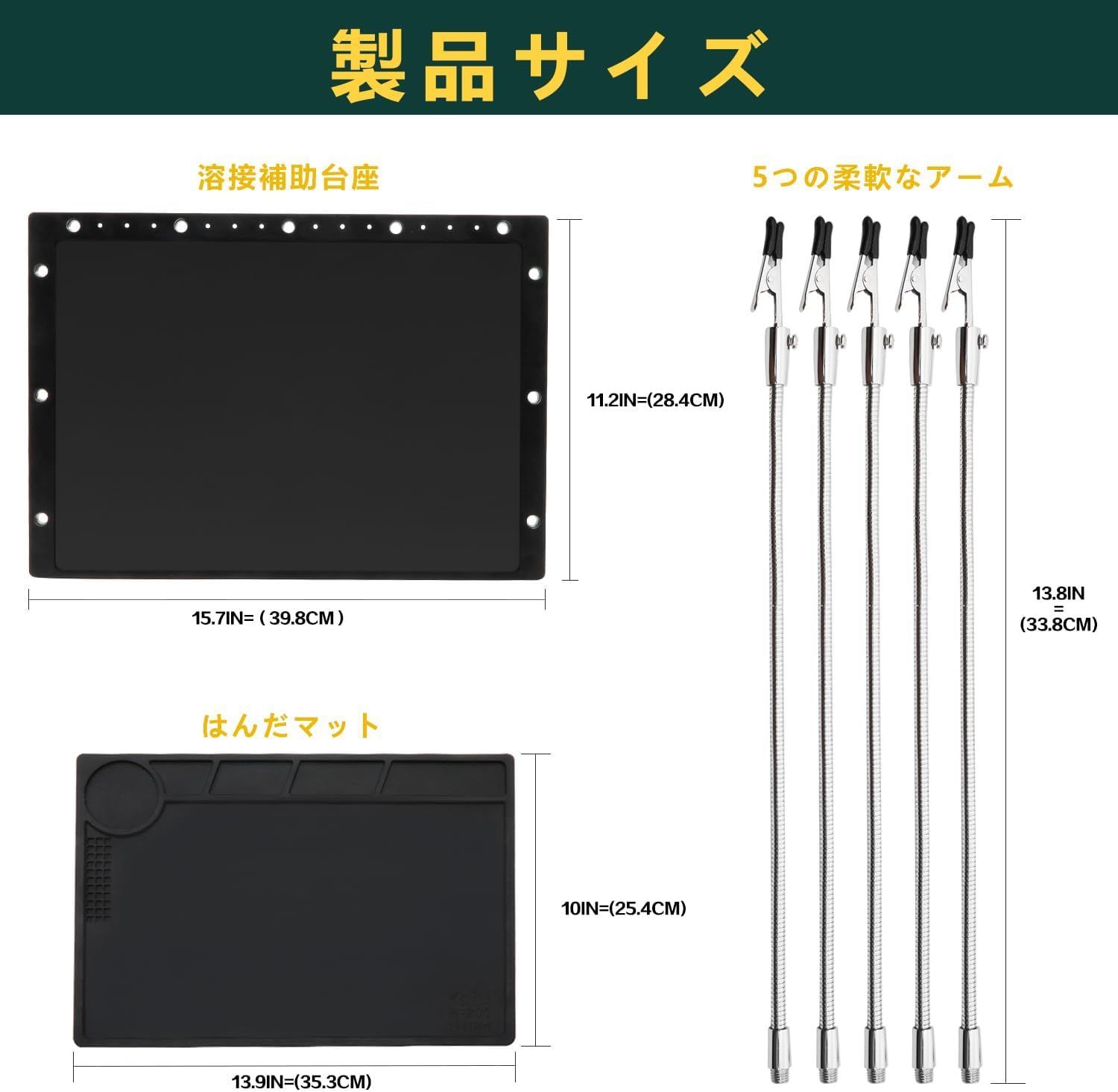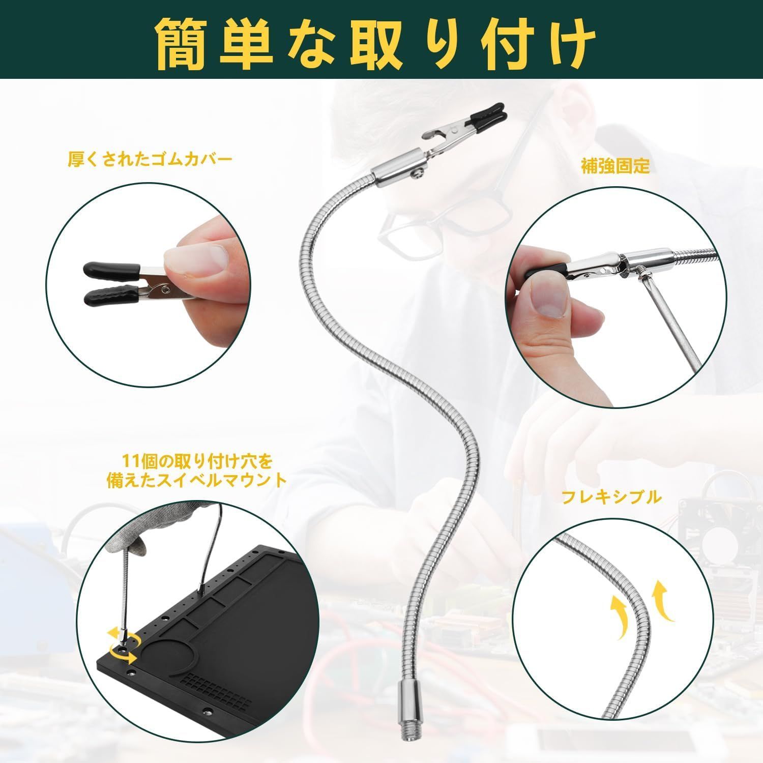 5本の調整可能な33.8センチ(13.3インチ)の金属グースネックアーム(はんだ付け補助具)と、底板上の異なる位置に固定できる11の延長アーム固定穴があり、自由に組み合わせることができます。