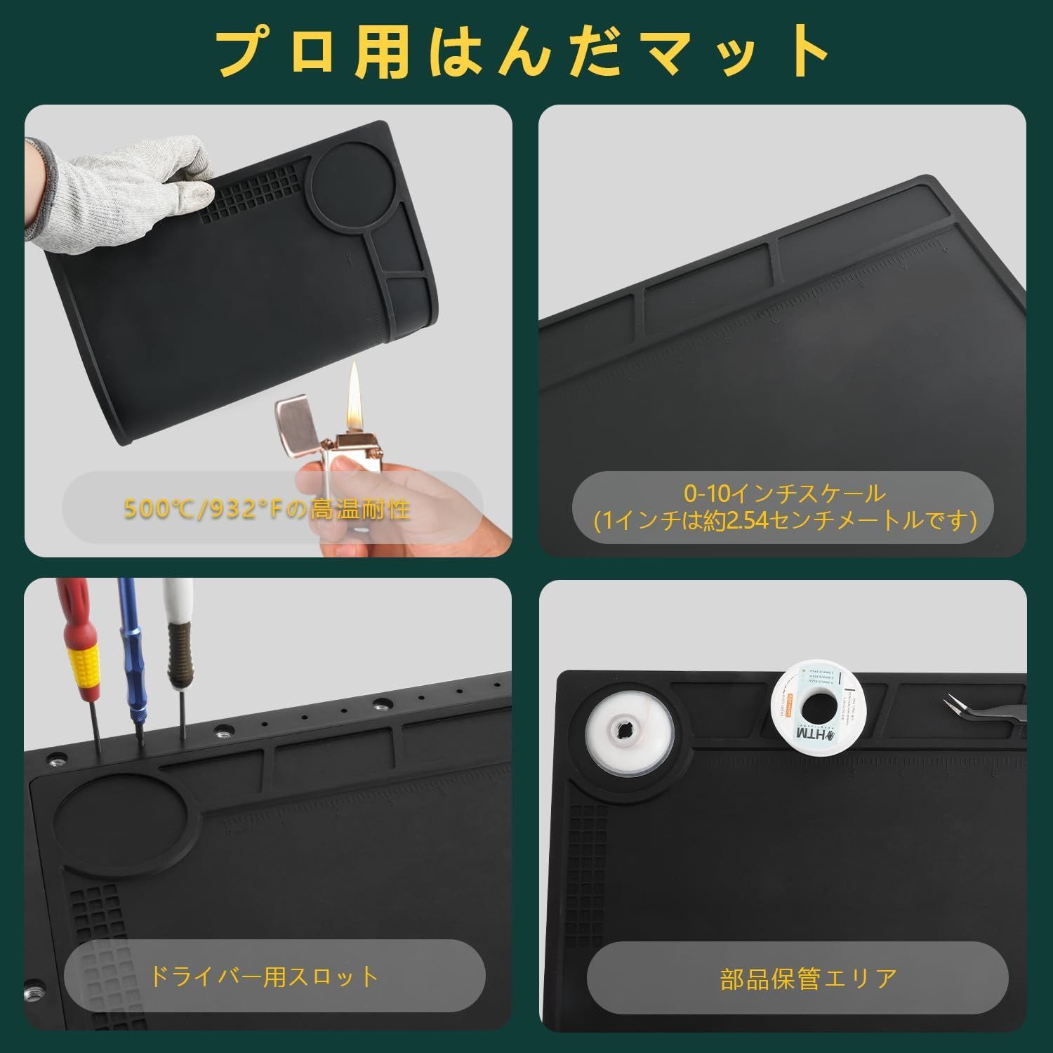他のシリコンはんだ付けマットよりも作業面の厚さが厚く、高温のはんだ付け作業に最適で、ヒートガンやはんだごてを直接マット上で使用することができ、作業台を焼けることや損傷から守ります。
