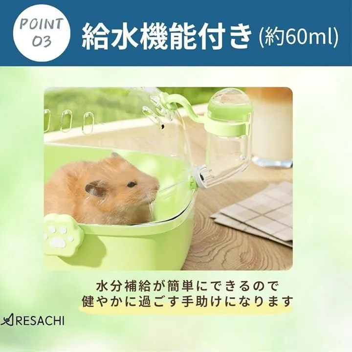 「便利な給水機能付き」給水機能が備わっており、外出中でもハムスターが水分をしっかり摂取できるようになっています。
