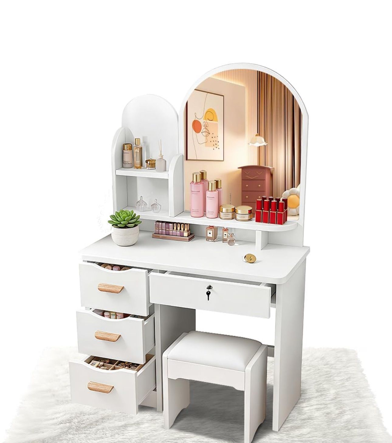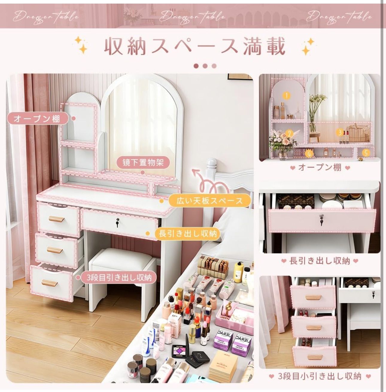 【豊富な収納スペース】独立大収納4箇があって誰にも収納達人になれます。 4つの引き出しと棚が特徴のバニティテーブルセットは、化粧品、マニキュア、香水、アイライナーなどを保管するのに十分なスペースを提供します。
