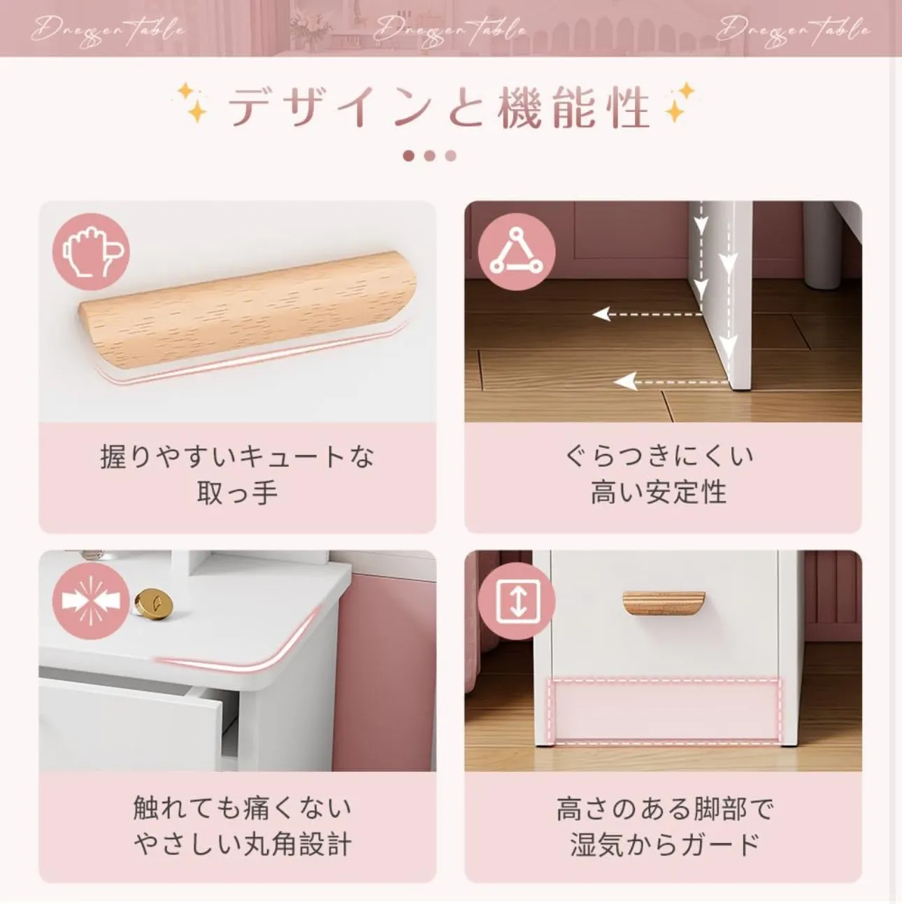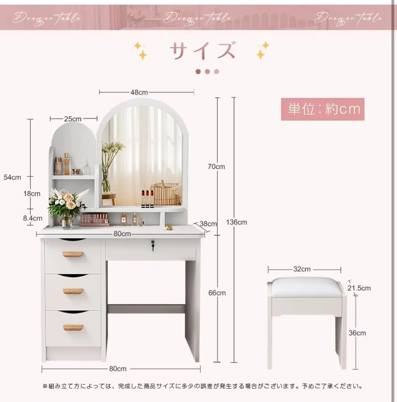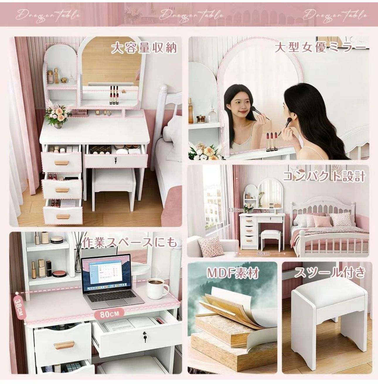 【商品仕様】 ・ドレッサー本体:メラミン外装 ・スツール本体: 木製 ・スツール座面生地:合成皮革 ※海外輸入品の為、運送中振動により多少傷や汚れが付きます、ご了承の上ご購入をお願い致します。目立つ傷や破損があった場合は無償交換させて頂きます。Emailでお気軽にお問合せください。