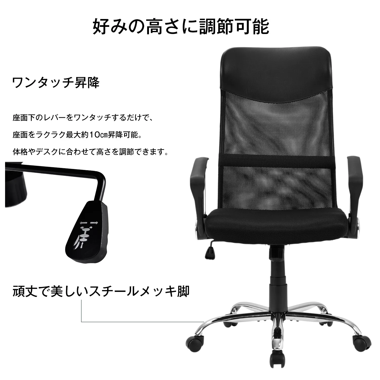 【商品仕様】商品サイズ:幅61(アーム含)×奥行51×高さ108-118cm(座面高(座面厚除く):45-55cm) 重量:13.3kg 静止耐荷重:約104KG 素材:張り地:プロ仕様 通気性良いメッシュチェア、PVC / 座面内部:ウレタン / フレーム:スチール(クロームメッキ塗装仕上げ)/キャスター:ナイロン
