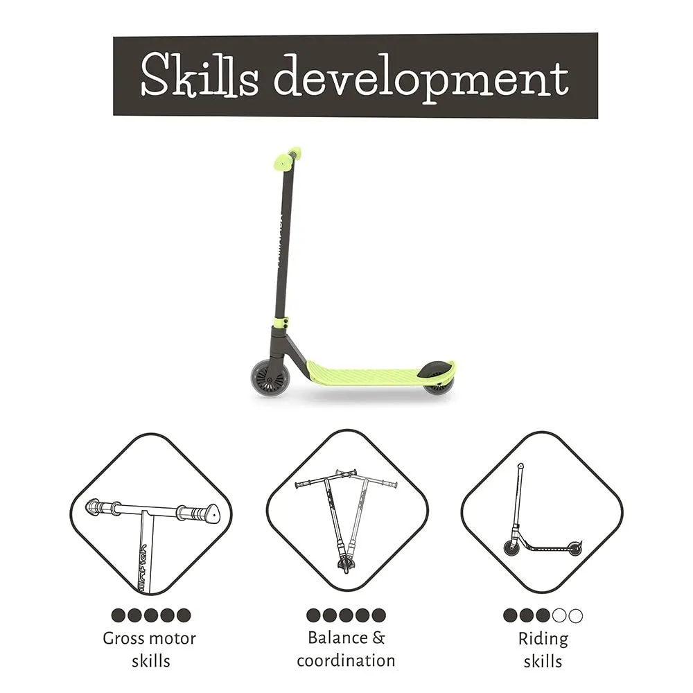 5歳から乗れる、丈夫で軽量な足けり2輪スタントスクーター。滑り止めがほどこされ、フットブレーキを備えたツインチップデッキデザイン。