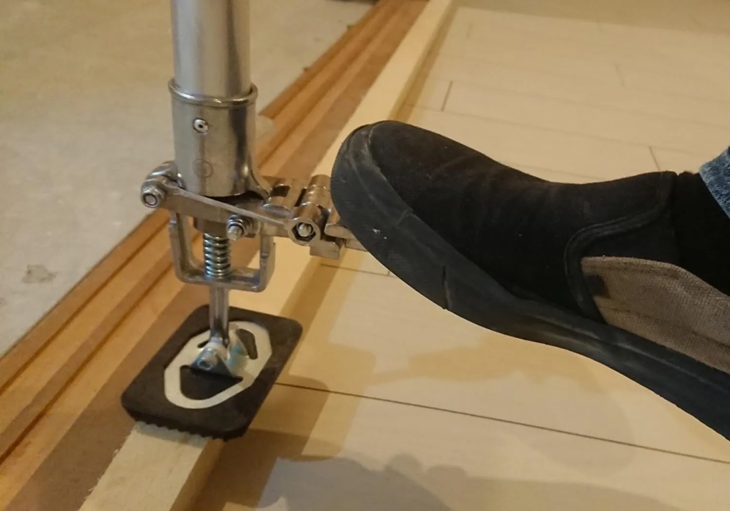 ・足踏みペダルで養生シート、天板など簡単に突っ張る事ができる