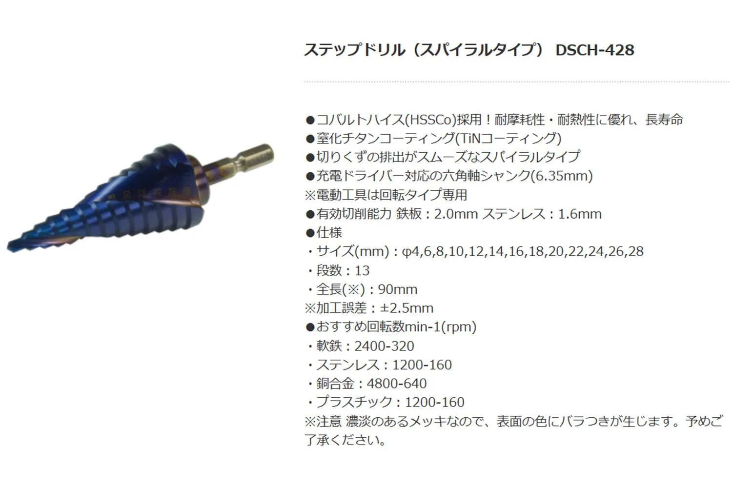 おすすめ回転数min-1(rpm):軟鉄/2400-320、ステンレス/1200-160、銅合金/4800-640、プラスチック/1200-160