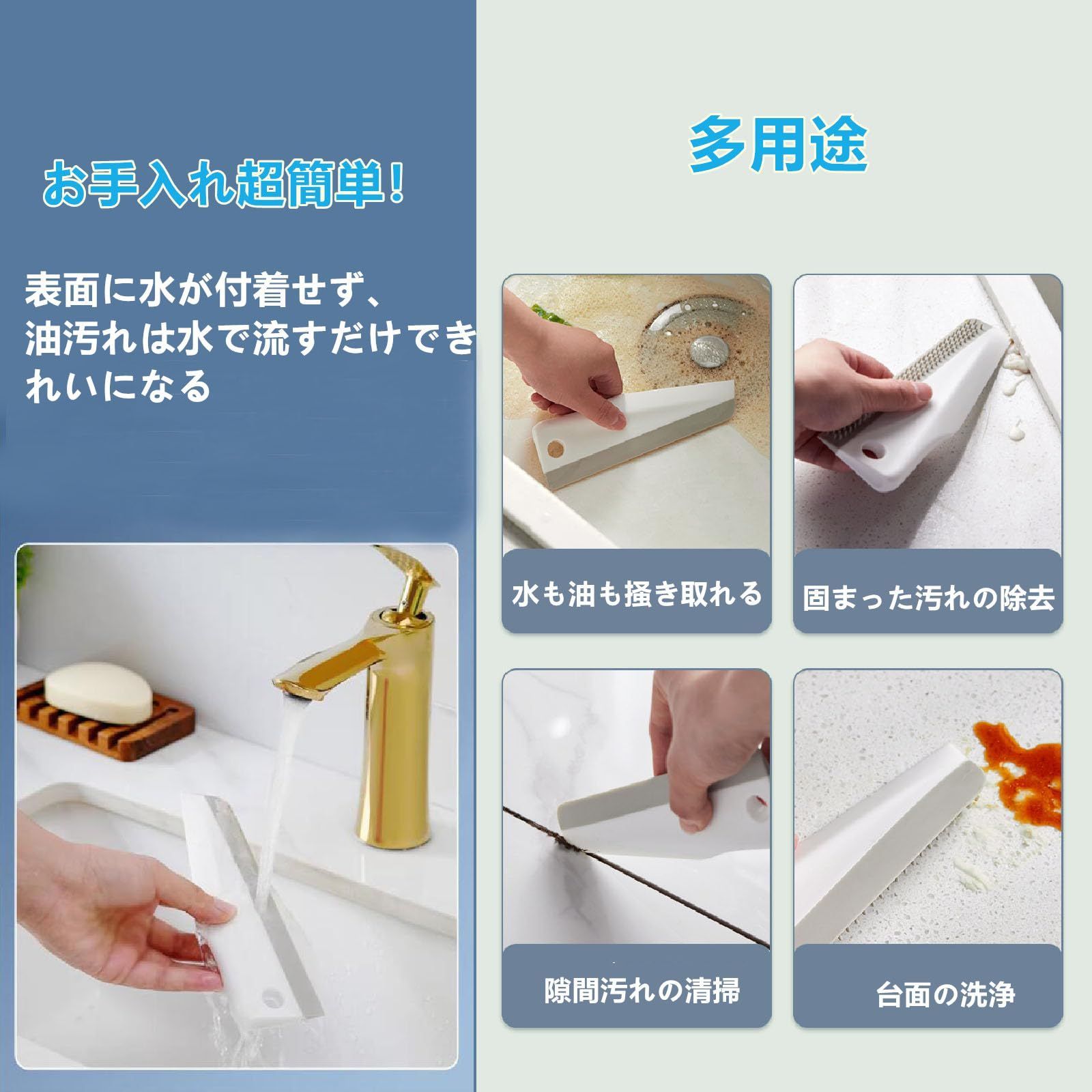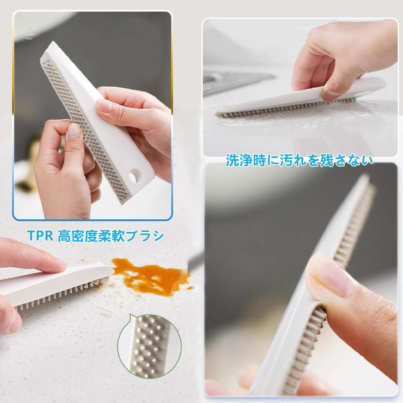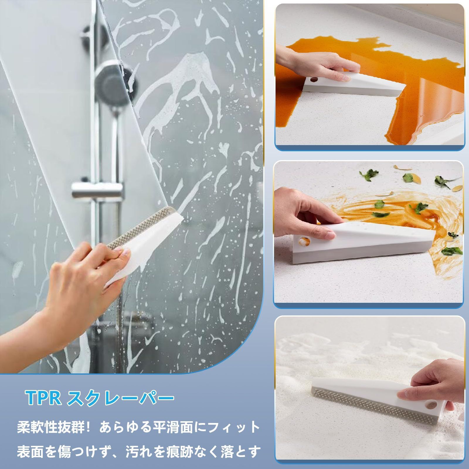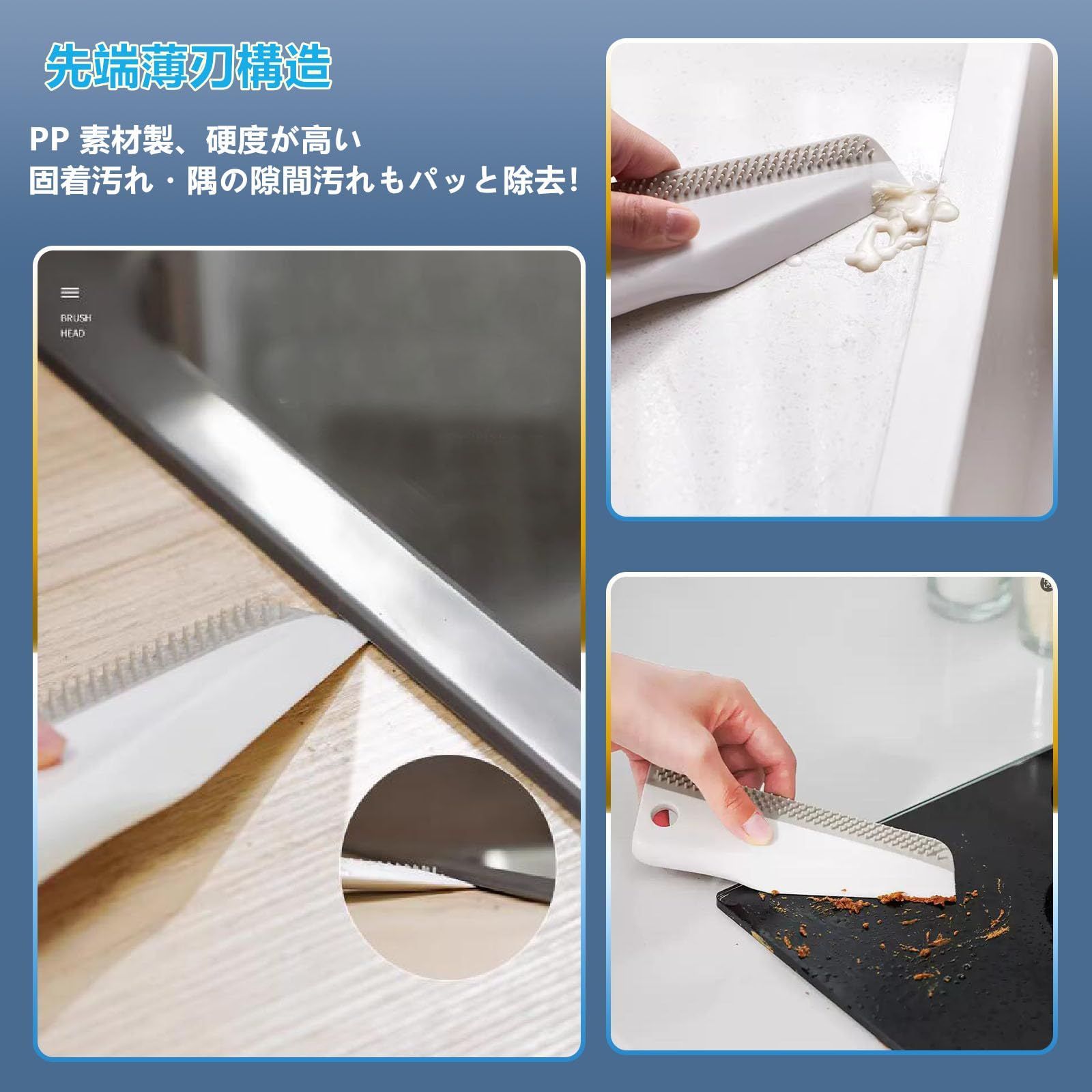 【両面スクレーパー・隅々まで死角なく掃除】 スクレイプ・削除・かき出し・ブラッシングの 4 機能を備え、ストレートエッジ・カーブエッジ・シャープエッジの 3 重設計で全シーン対応。TPR ブラシで頑固汚れを落とし、ストレートエッジで水や油を掻き、PP シャープエッジで固まった汚れや隙間を掃除。単機能の悩みを解消、キッチン・浴室・車洗いに活躍。