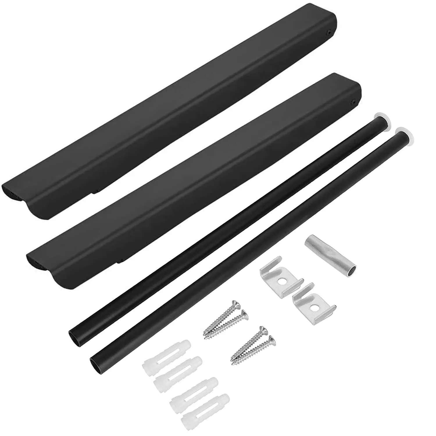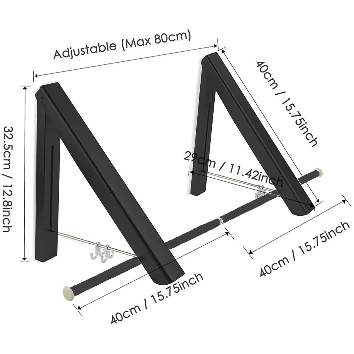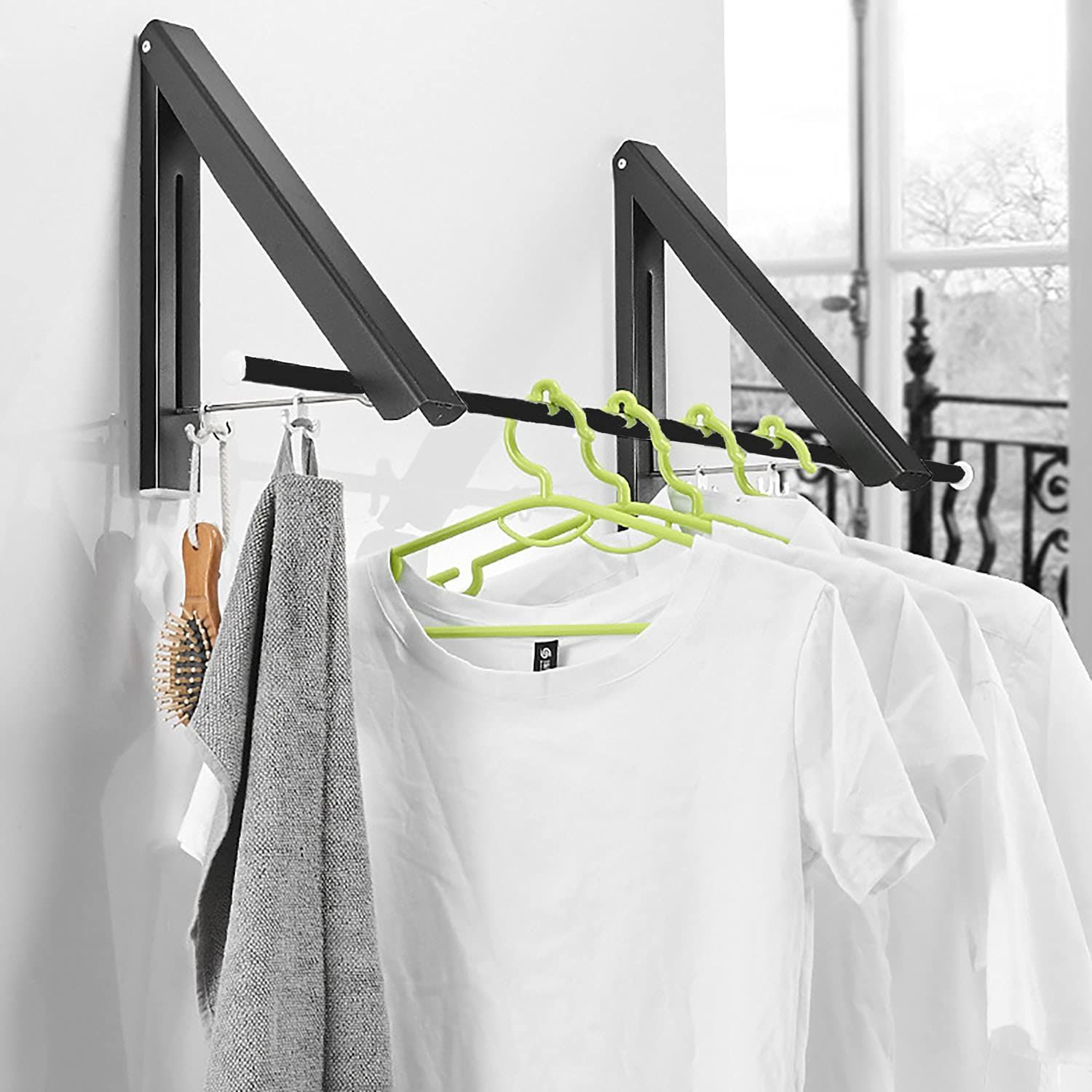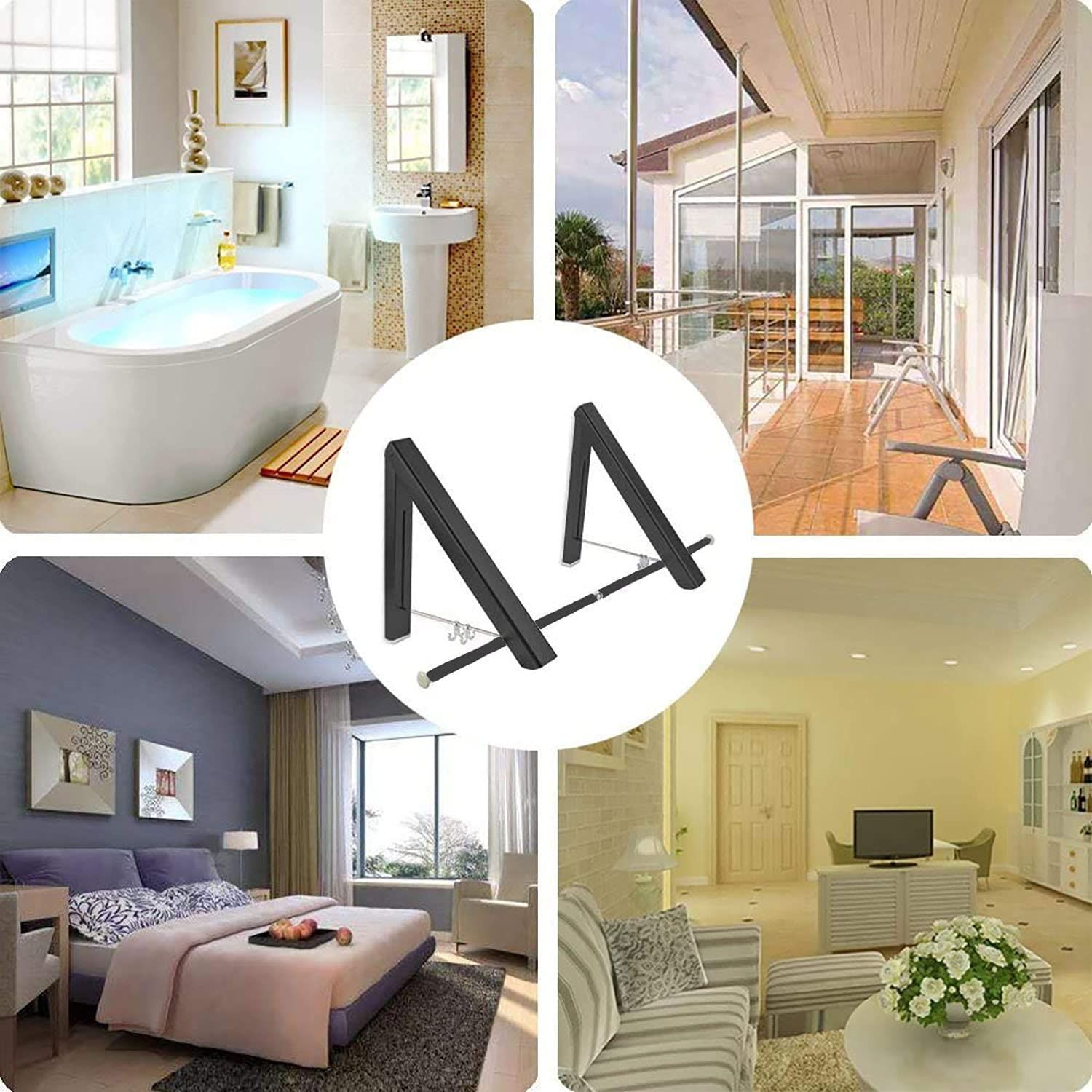 FChome折りたたみハンガーウォールマウント4つのフック付き 、テンションロッド付きウォールマウントウォールマウントコートラック乾燥ラックタオルラック、ベッドルーム/バスルーム/オフィス/エントランス/バルコニー物干しライトアルミニウム2ピースアセンブリ、ブラック