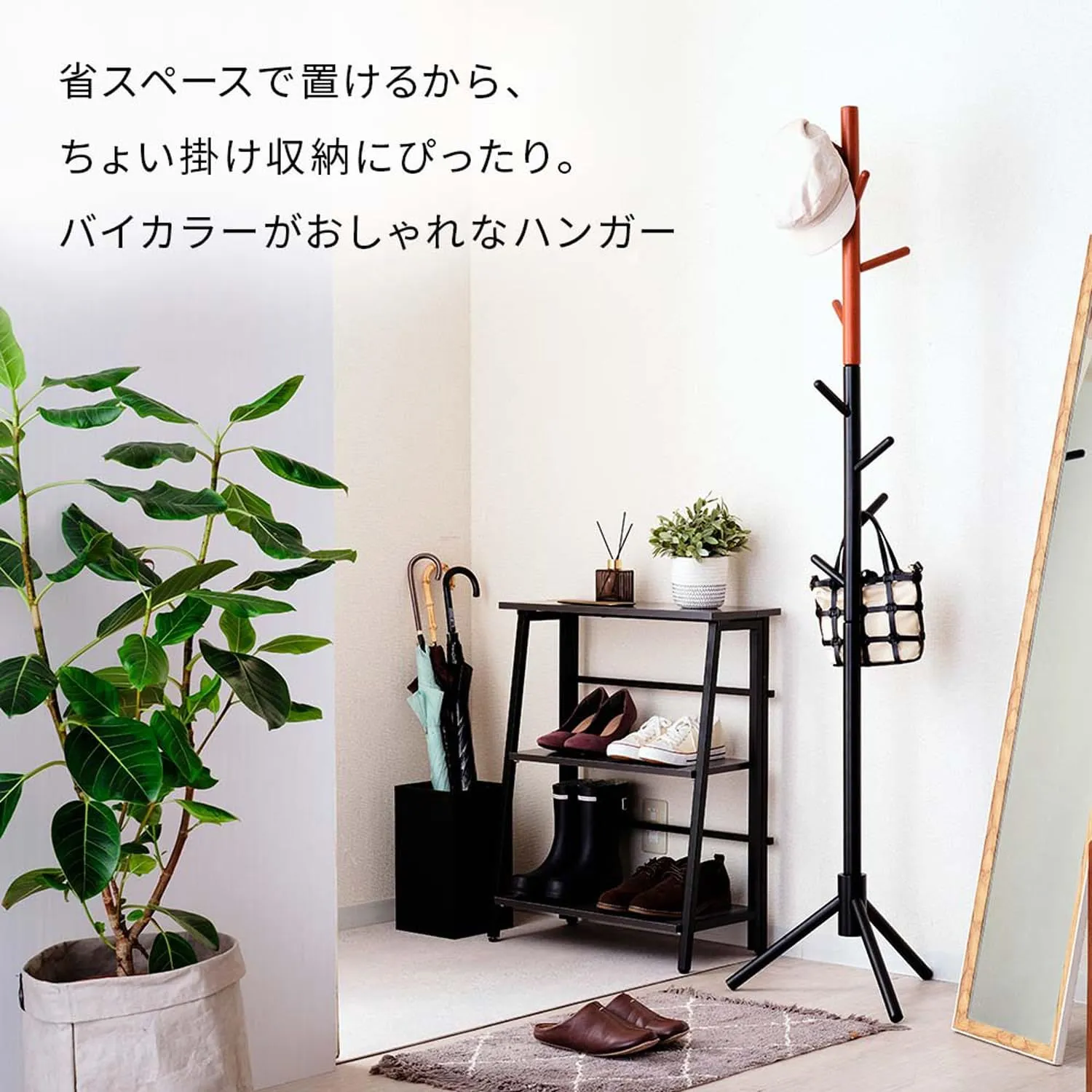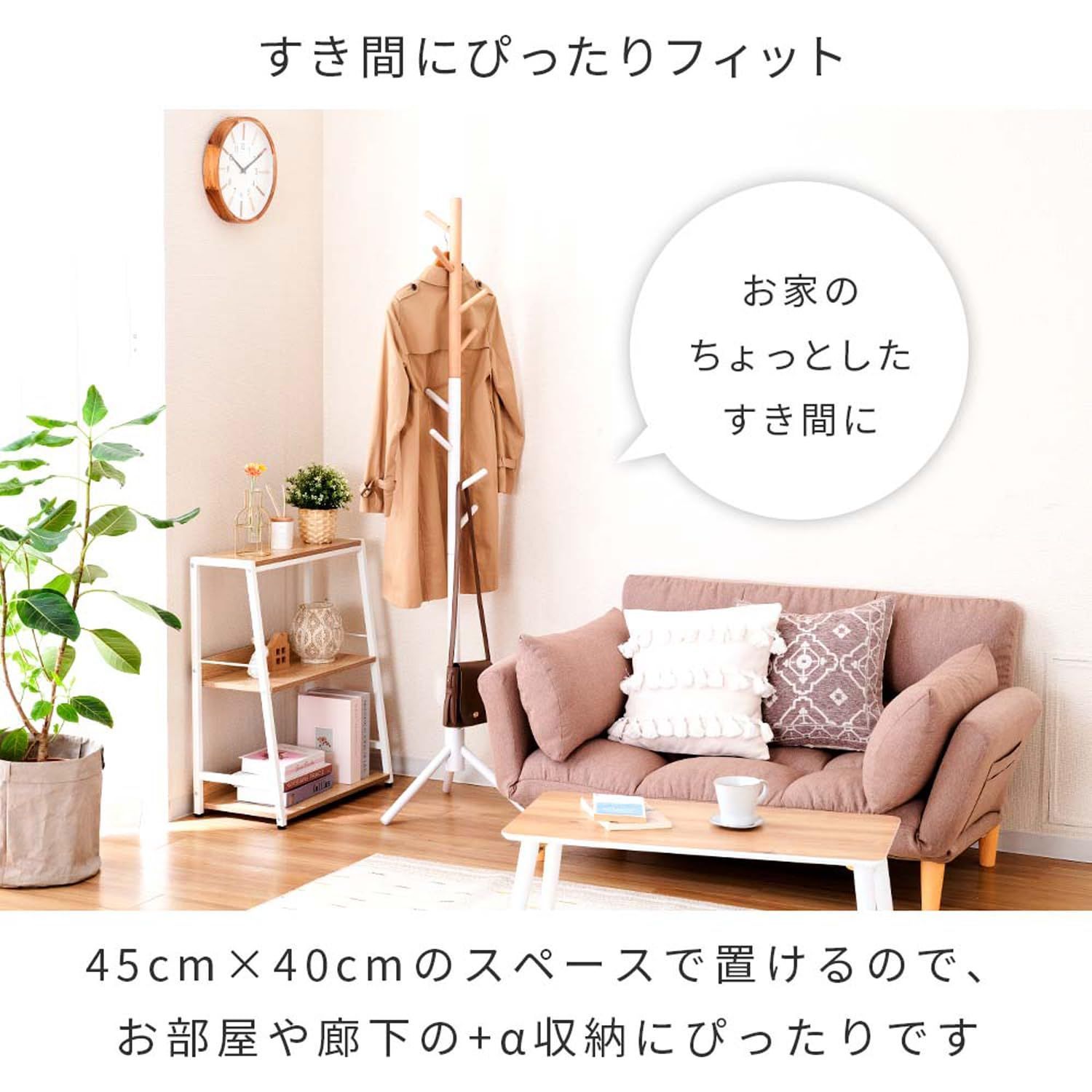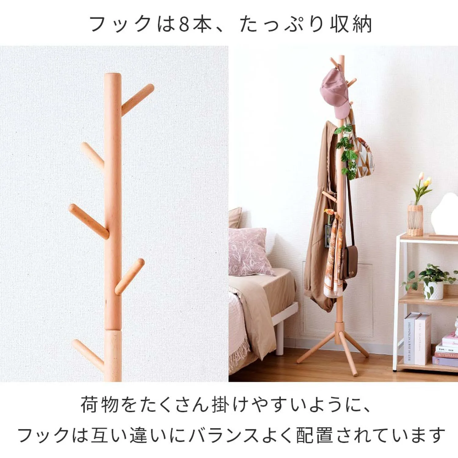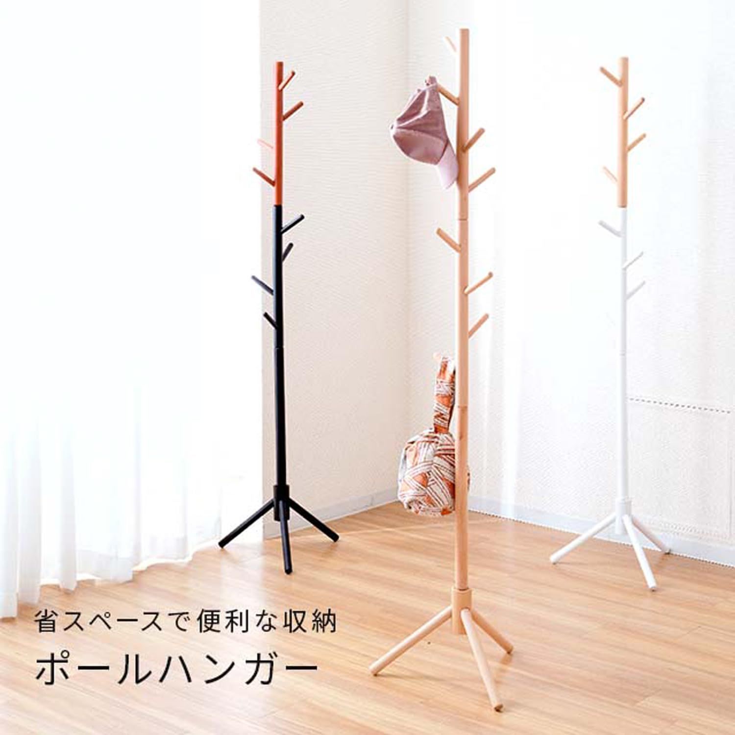 省スペースで置けるからちょい掛け収納にぴったり。天然木でおしゃれな北欧テイストのポールハンガー。
