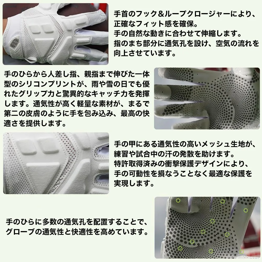 特許取得済みの衝撃保護: 手の甲と親指には特許取得済みのシリコン充填衝撃保護機能が搭載されており、衝突や乱暴なキャッチによる手の怪我のリスクを大幅に軽減します。