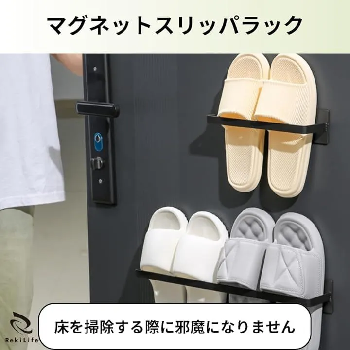 「浮かせて収納」散らかりやすく収納に困るスリッパを浮かせて収納できるマグネットスリッパラックです。