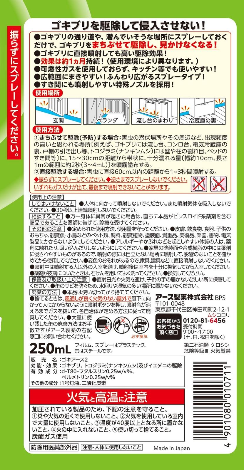 ゴキブリが出てくると嫌な台所や、通り道、潜んでいそうな場所にスプレーしておくだけでゴキブリを駆除し、見かけなくなります。