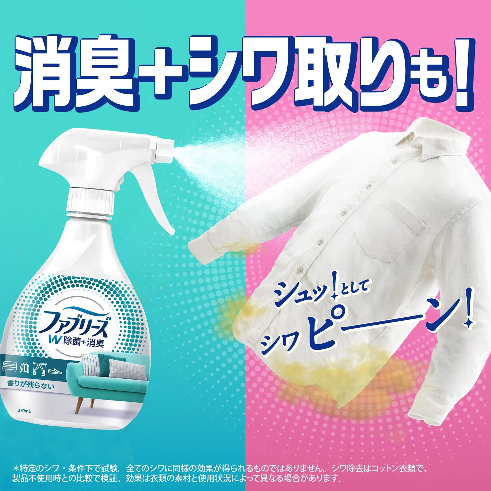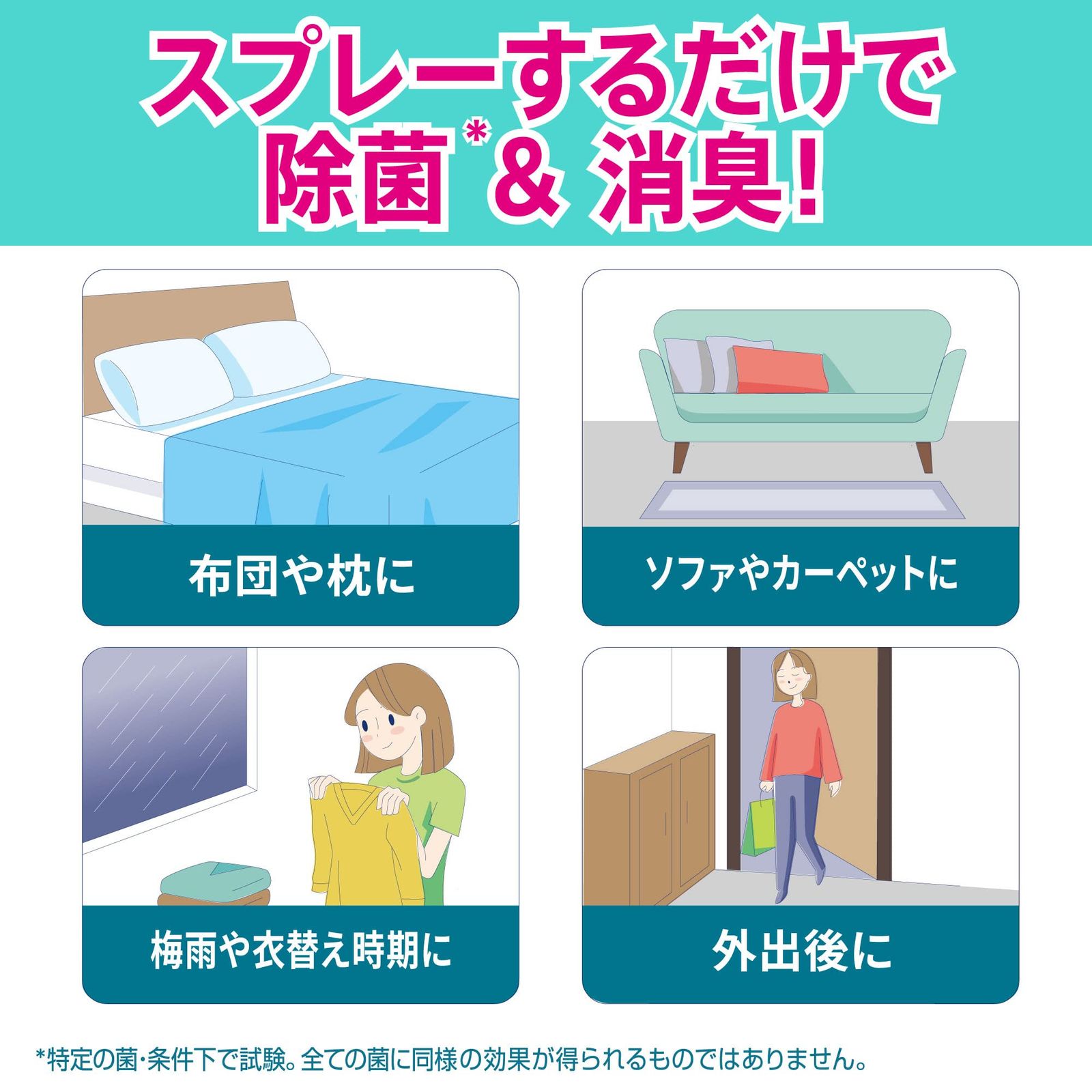 速攻消臭* + シワ取り** 衣類、靴、布団、ソファなど ウイルス除去** + 72時間抗菌防臭**。 スプレーするだけで除菌**&消臭*
