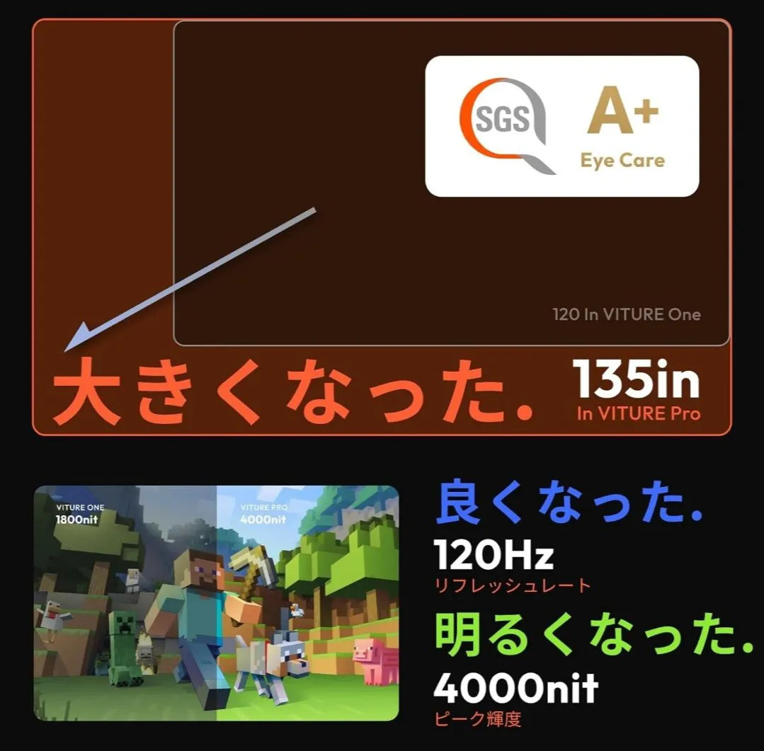 【VITURE高輝度のディスプレイ】高精細な135インチ相当の大画面と、4000ニット(体感輝度1000ニット)の高輝度、滑らかな120Hz駆動のフルHD UltraClarityディスプレイを搭載。従来モデルと比べて画面サイズが10%大きく、輝度は120%アップ、リフレッシュレートは2倍になり、より没入感ある映像体験をお届け。