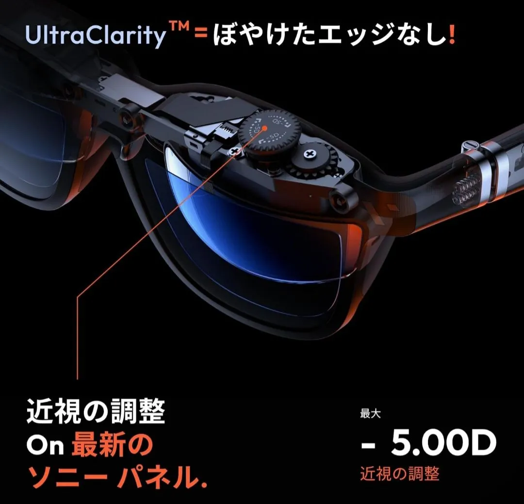 【視認性が格段にレベルアップ】- 独自開発のUltraClarity技術により、画面の端までクッキリとした明るさを実現。小さめの文字も鮮明に表示され、反射防止・ゴースト防止・酔い防止を施したことで、長時間の使用でも快適に使えます。重要なポイント:1) 瞳孔間距離(IPD)が画質を左右します(理想は67.5mm未満、67.5~70.5mmではエッジがややぼやける場合あり、70.5mm以上は非推奨)。2) フィット感が最重要です。輪郭のぼやけや表示欠けがある場合は、ノーズパッドとツルの調整を行ってください。詳細は取扱説明書をご参照ください。