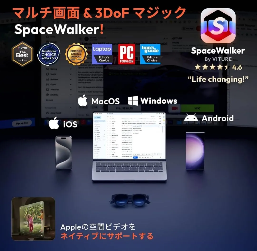 【究極の体験 = 最高のハードウェア + 最強のソフトウェア】高く評価されている当社のSpaceWalkerは、iPhone、Android、macOS、Windowsで利用可能になりました! ハードウェアはソフトウェアなしでは何もないため、最初から両方に焦点を当てています。 iPhoneで最初で唯一のXR体験として、このXRメガネは、わずかなコストで完全なXR体験(マルチスクリーン/3DoF/VRビデオ/1-Click 3D)を提供します。 このマルチスクリーンマジックは、AndroidとMacBookにも搭載されています。