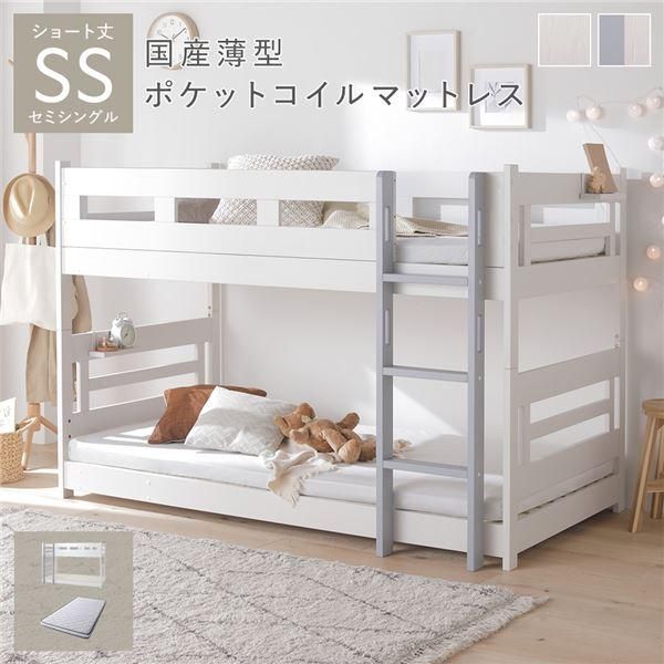 商品名:2段 ベッド ショート丈セミシングル 国産薄型ポケットコイルマットレス付き ホワイト×グレー 連結&分割可 組立品