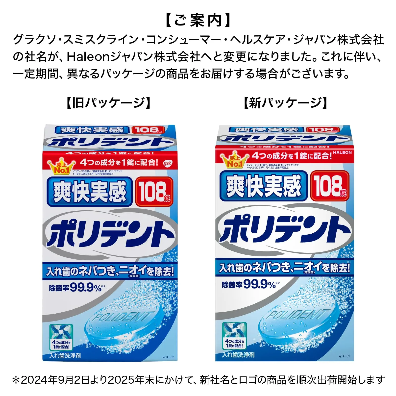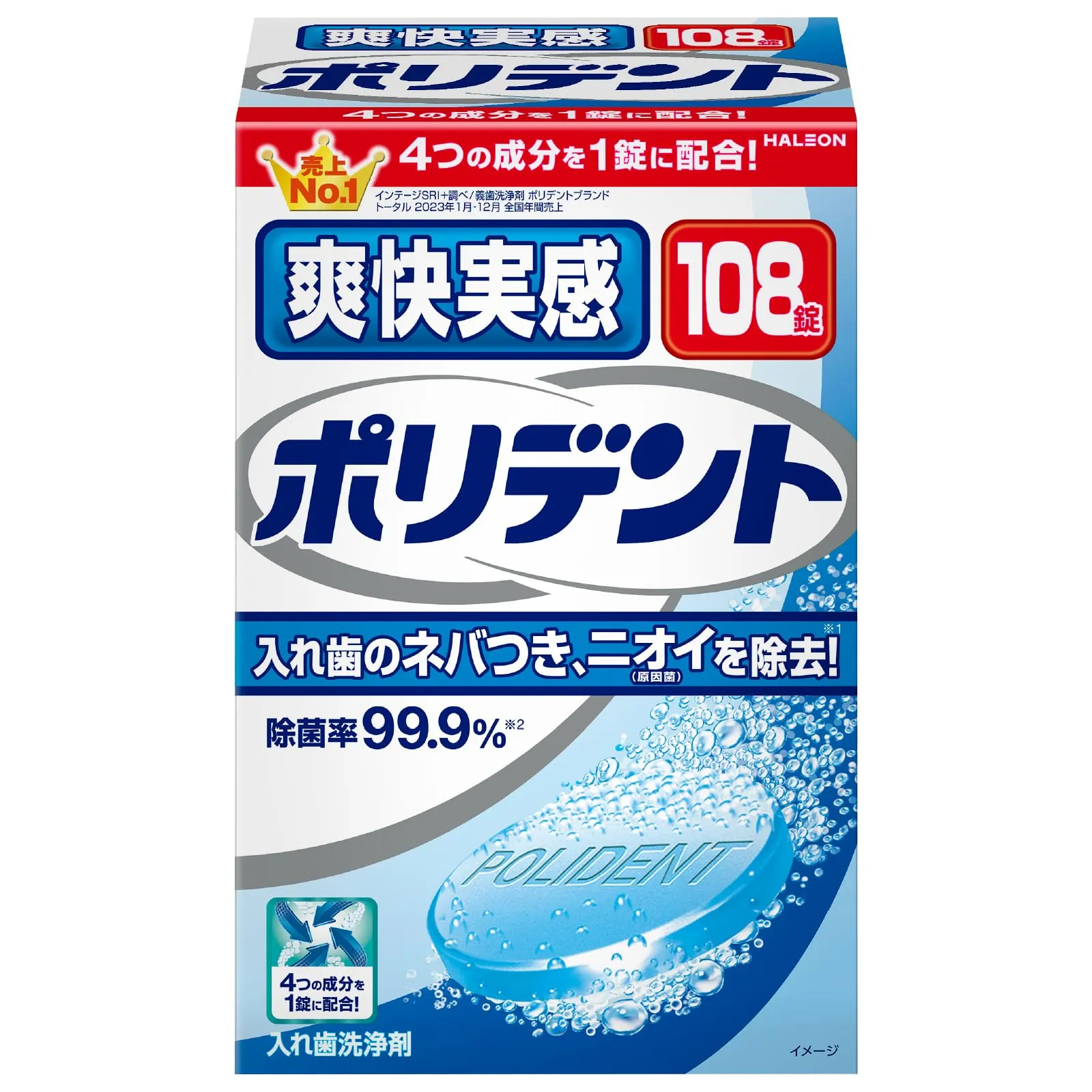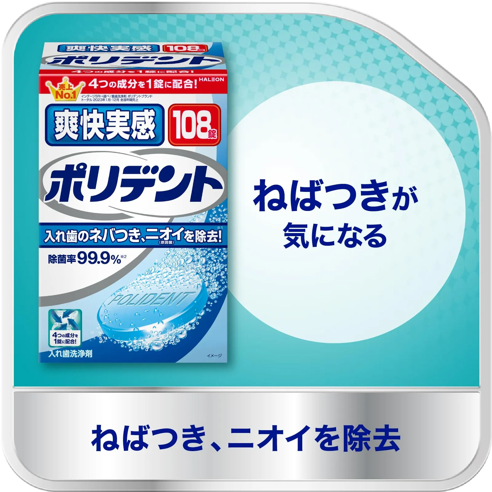 「入れ歯洗浄剤 爽快実感 ポリデント」は3分で入れ歯のニオイの原因菌を99.9%除菌する入れ歯洗浄剤です。入れ歯のネバつきをとり、ミント成分が入れ歯をさわやかに保ちます。 一部の部分入れ歯には使用できません。