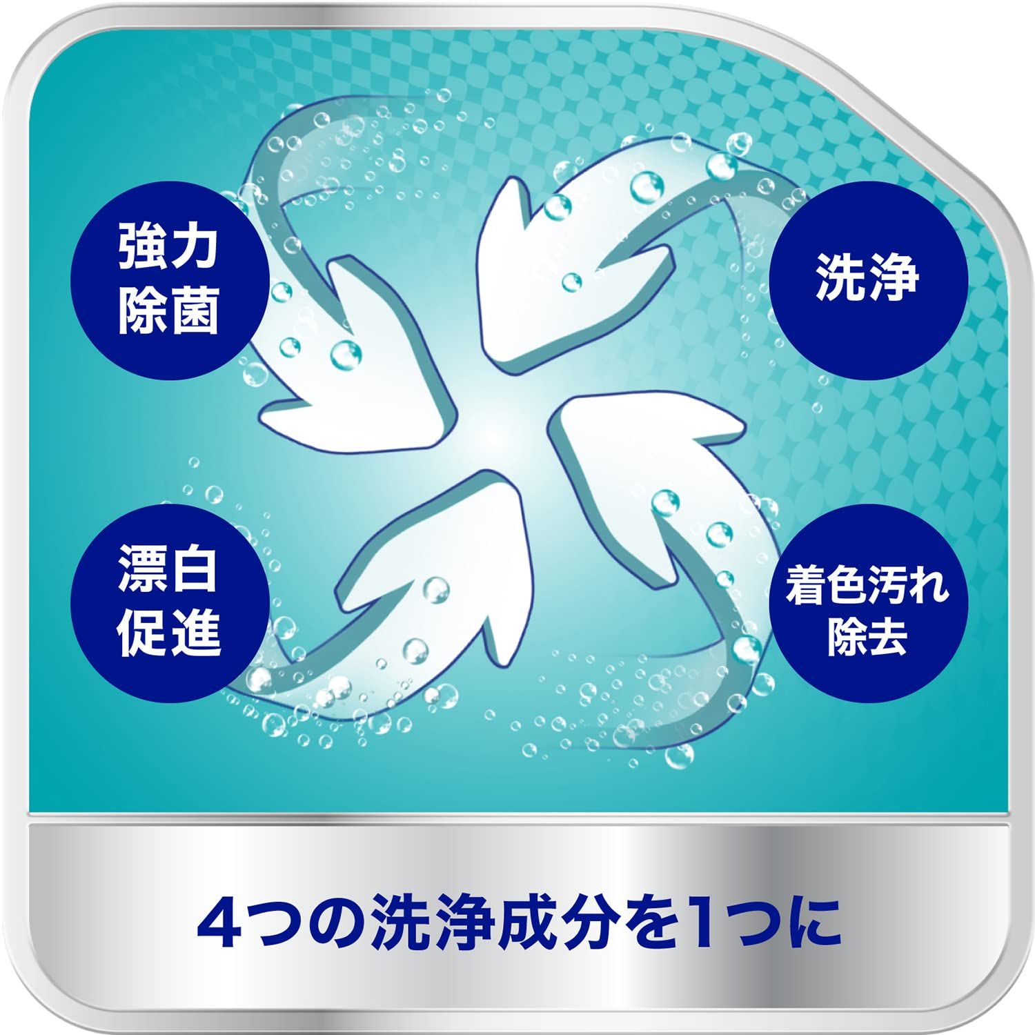 重炭酸ナトリウム、クエン酸、過硫酸カリウム、過炭酸ナトリウム、炭酸ナトリウム、安息香酸ナトリウム、ポリエチレングリコール、テトラアセチルエチレンジアミン、ラウリル硫酸ナトリウム、ビニルピロリドン/酢酸ビニル共重合体、セルロースガム、香料、青色1号アルミニウムレーキ、青