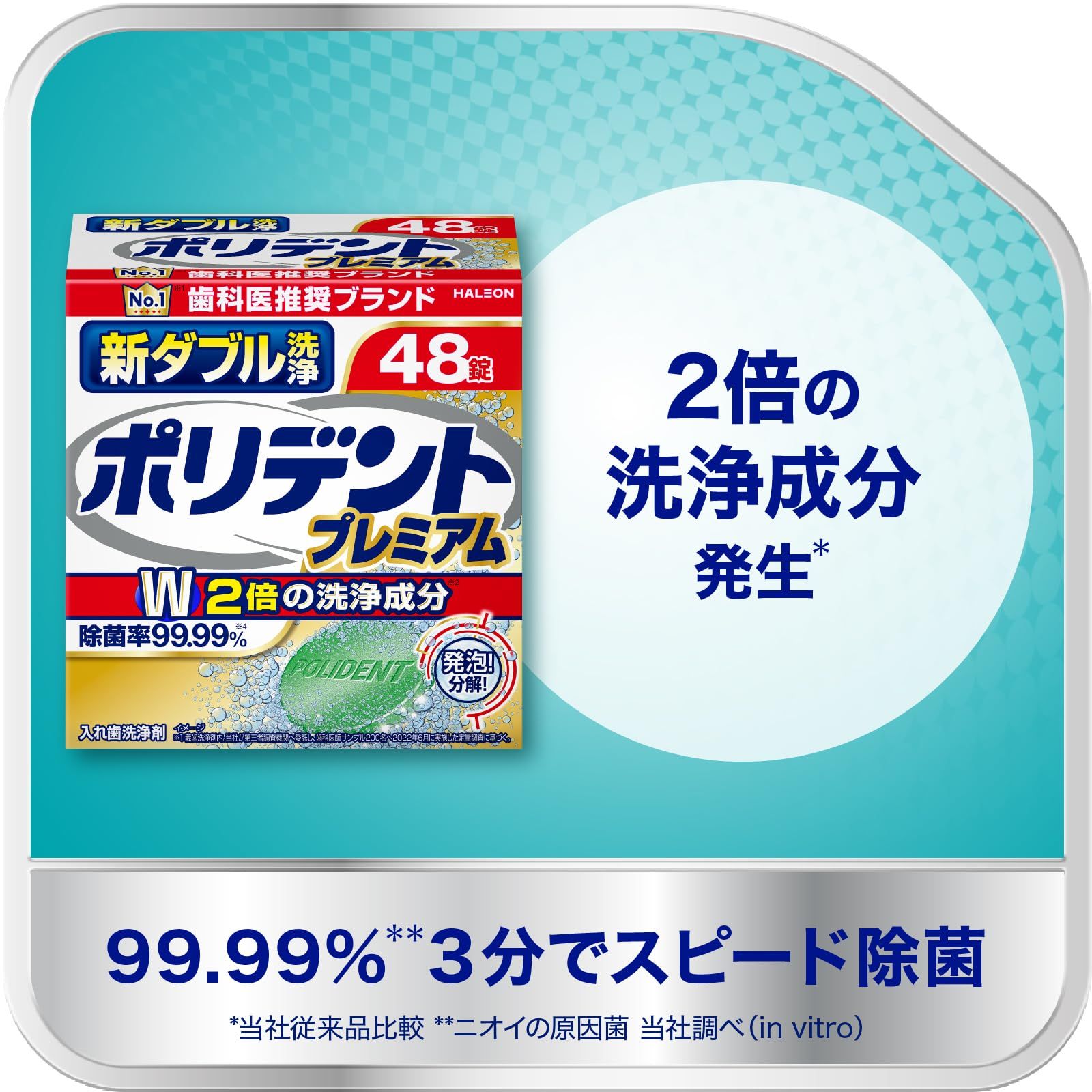 「新ダブル洗浄 ポリデント」は、2倍の洗浄成分*の入れ歯洗浄剤です。*(当社従来品比較) *洗浄力が2倍あるわけではありません