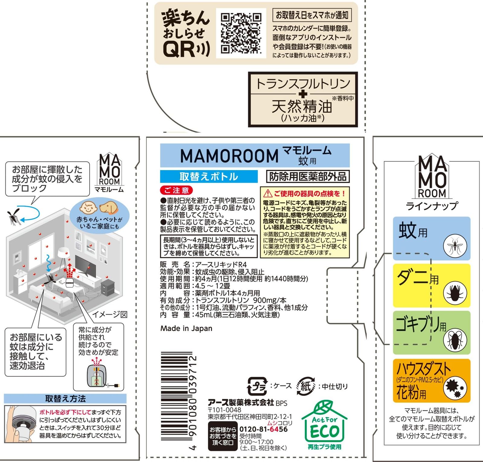 【マモルームラインナップ】蚊用・ダニ用:取替え時には、どのボトルでもお好みに応じて使えます。