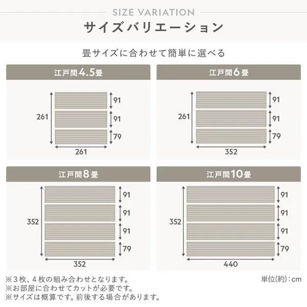 江戸間10畳用:352cm×440cm(91cm×440cm 3枚、79cm×440cm 1枚)
