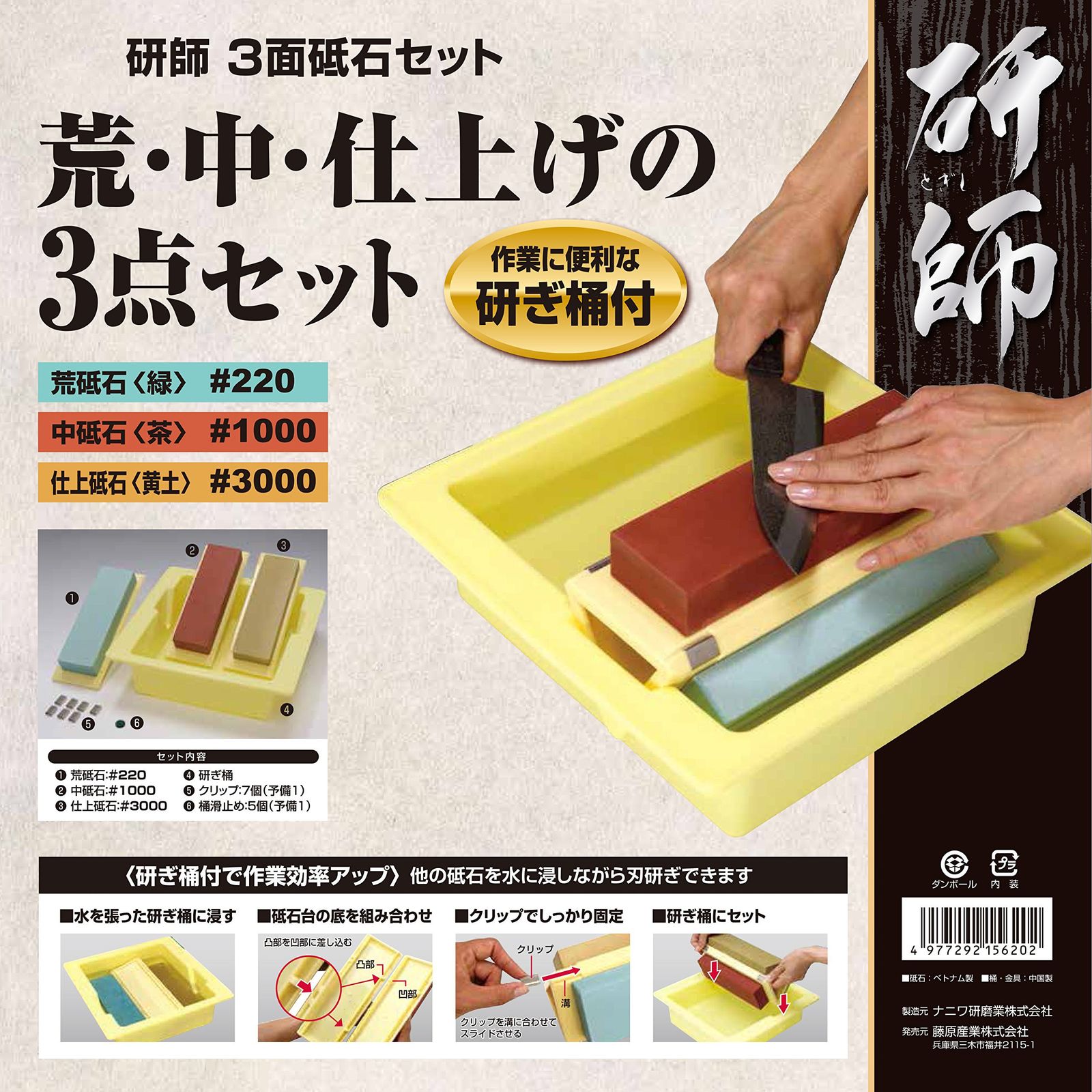 特徴:荒・中・仕上げの3種類の砥石のセット品、刃物の状態に合わせて使う砥石を選択できる