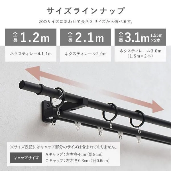 ポール1本、キャップ2コ、リングランナー10コ、エンドリングランナー1組、Nダブルブラケット2コ、ネクスティレール1本、ネクスティキャップストップ2コ、ネクスティランナー9コ、ネクスティサイドマグネットランナー1コ、取付ネジ