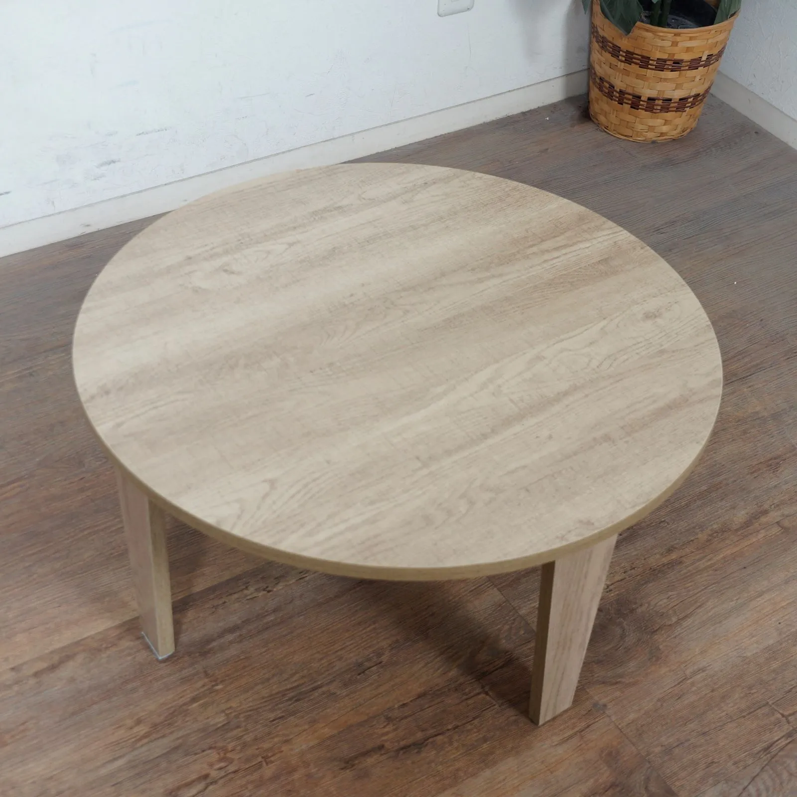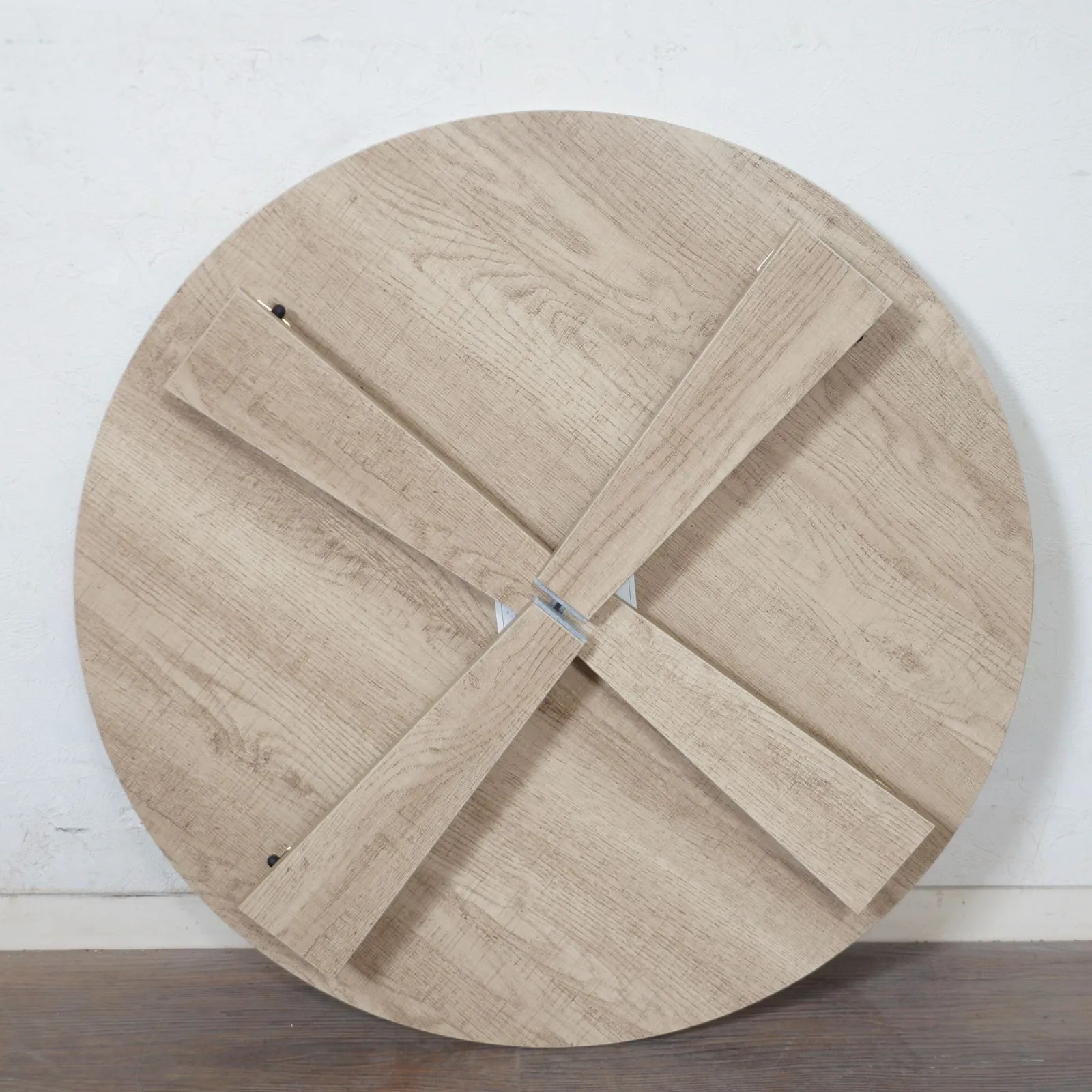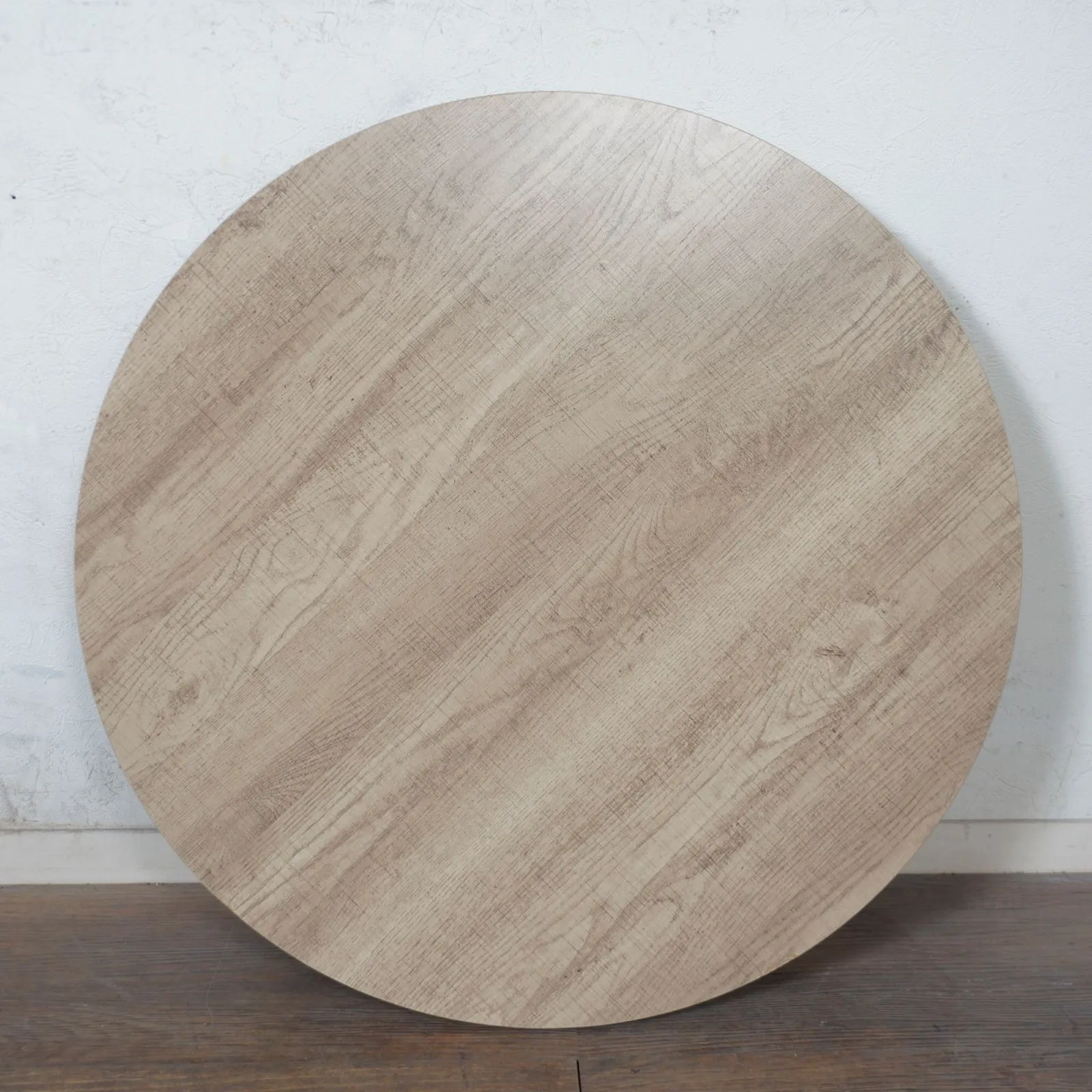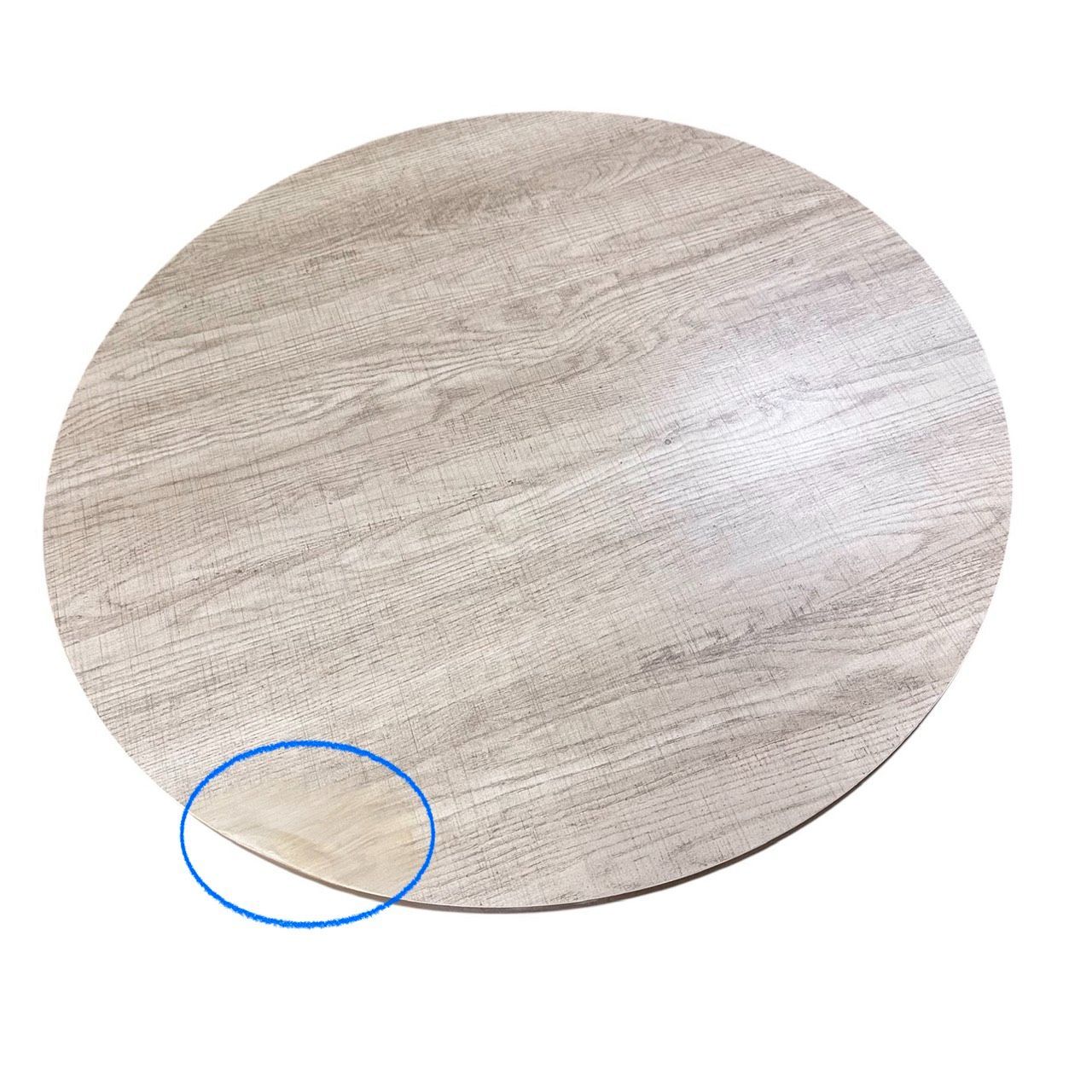 まるで天然木のような古木調の色合いと木目感の再現にこだわった円形テーブル。折りたたみ機能付き。