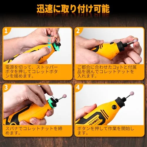 【127点組付属品付き】電動ルーターは127点組の付属品が付いてるので、彫刻/穴あけ/研磨/切断/切削/つや出し/マニキュア/汚れ落としなどの作業はラクにやることができます。他の低回転ホビールーターと比較して作業の幅も広がり快適な作業が可能です。