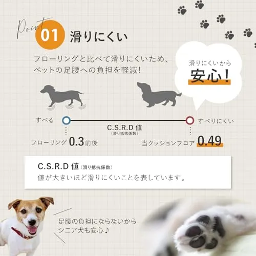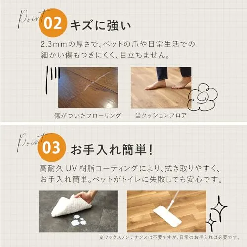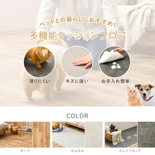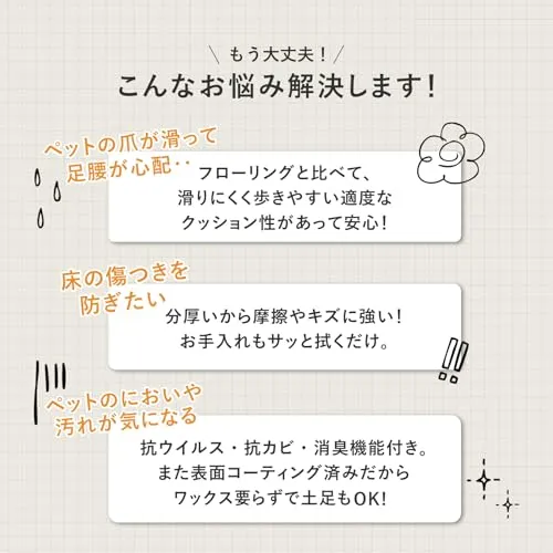 表面が滑りにくくキズがつきにくい。さらに消臭機能やクッション性なども備えたペットのいるご家庭にも安心なクッションフロアシートです。食べ物をこぼしたり粗相をしたりしてもサッと簡単に拭き取ることができます。ペットのスペース作りはもちろん、キッチンやトイレにもおすすめです。土足OKなので玄関にも。