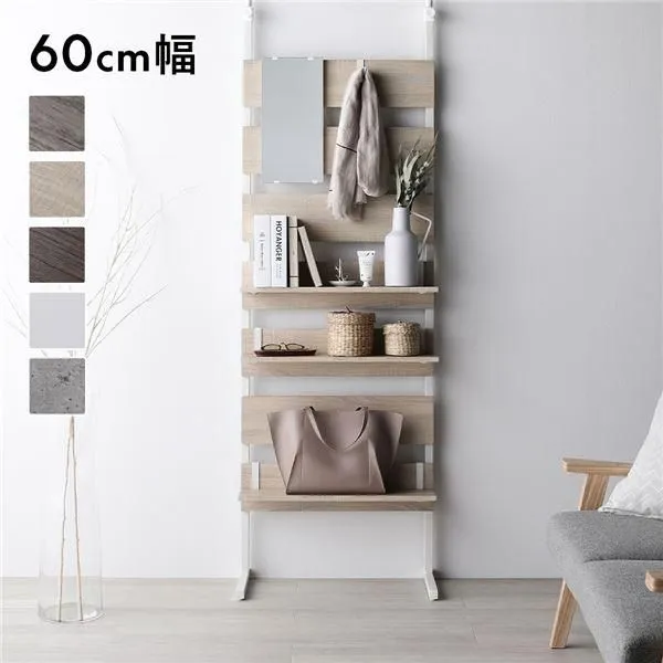 商品名:突っ張り ウォールラック 〔 60cm幅 ナチュラル×ホワイト 〕 ミラー付き 壁面収納 棚 賃貸OK 組立品