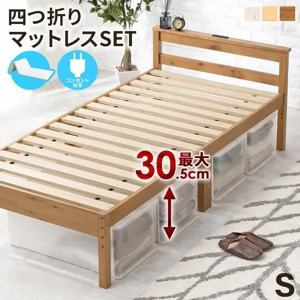 商品名:四つ折りマットレス付 天然木すのこ シングルベッド プレーンナチュラル 2口コンセント付 高さ3段階調節可 約39/34/29cm 組立式